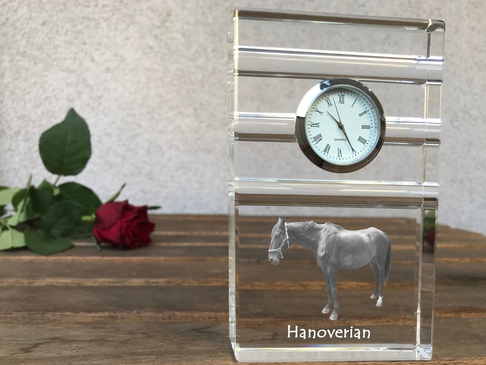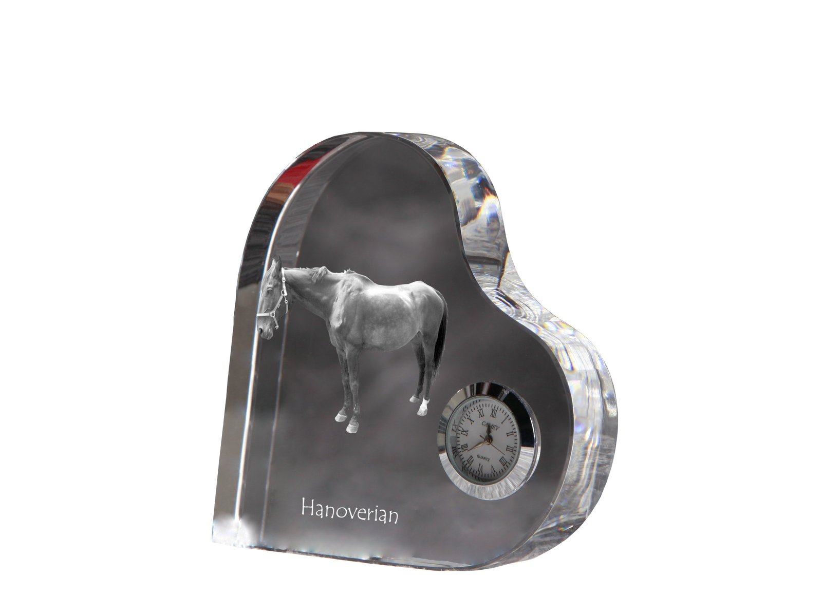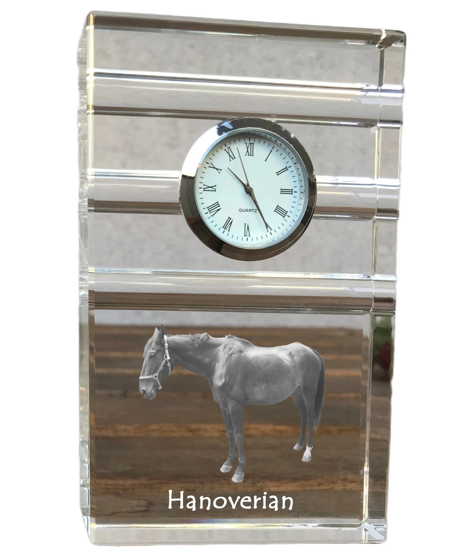 Hanoverių veislės – Krištolo laikrodis su arklio nuotrauka