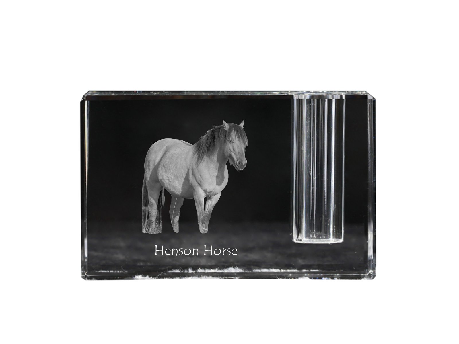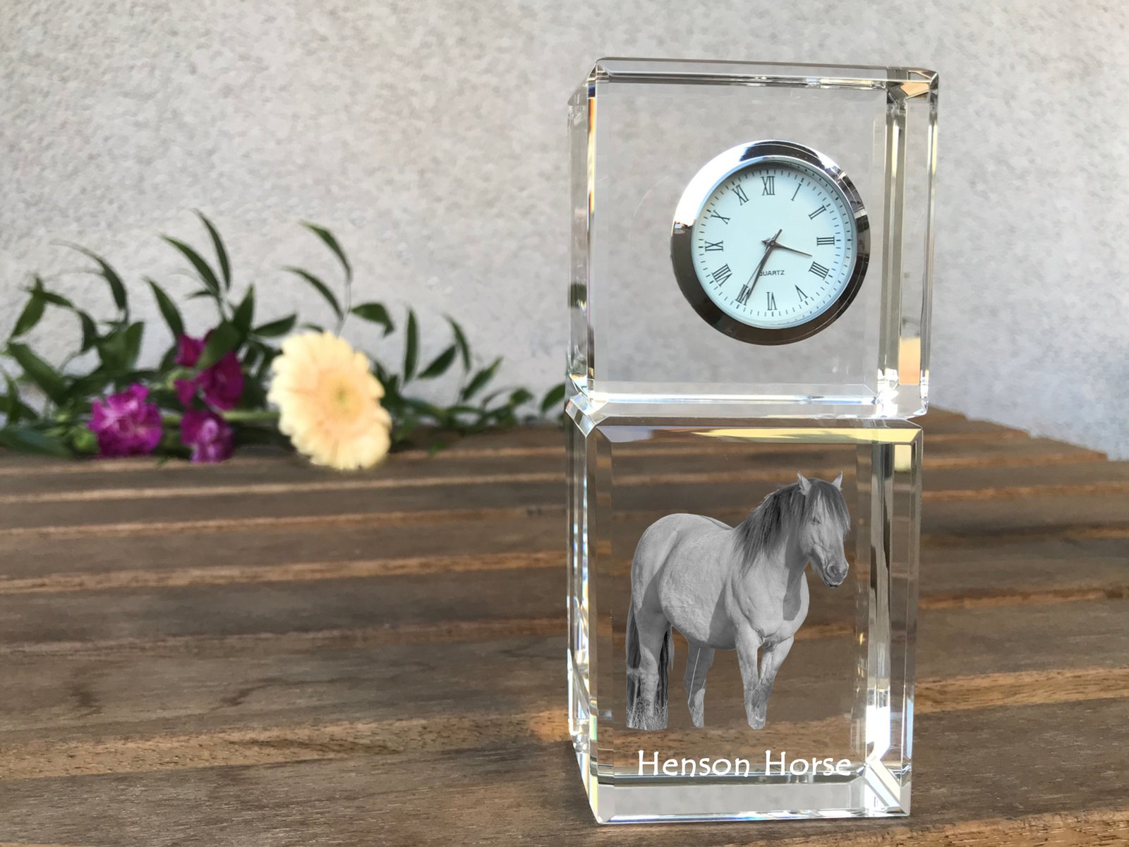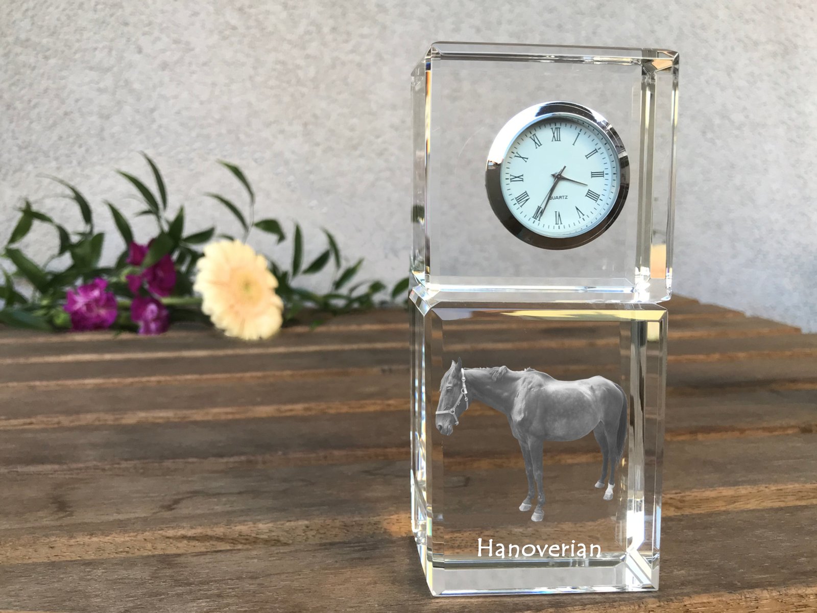 Hanoverių veislės – Krištolo laikrodis su arklio nuotrauka