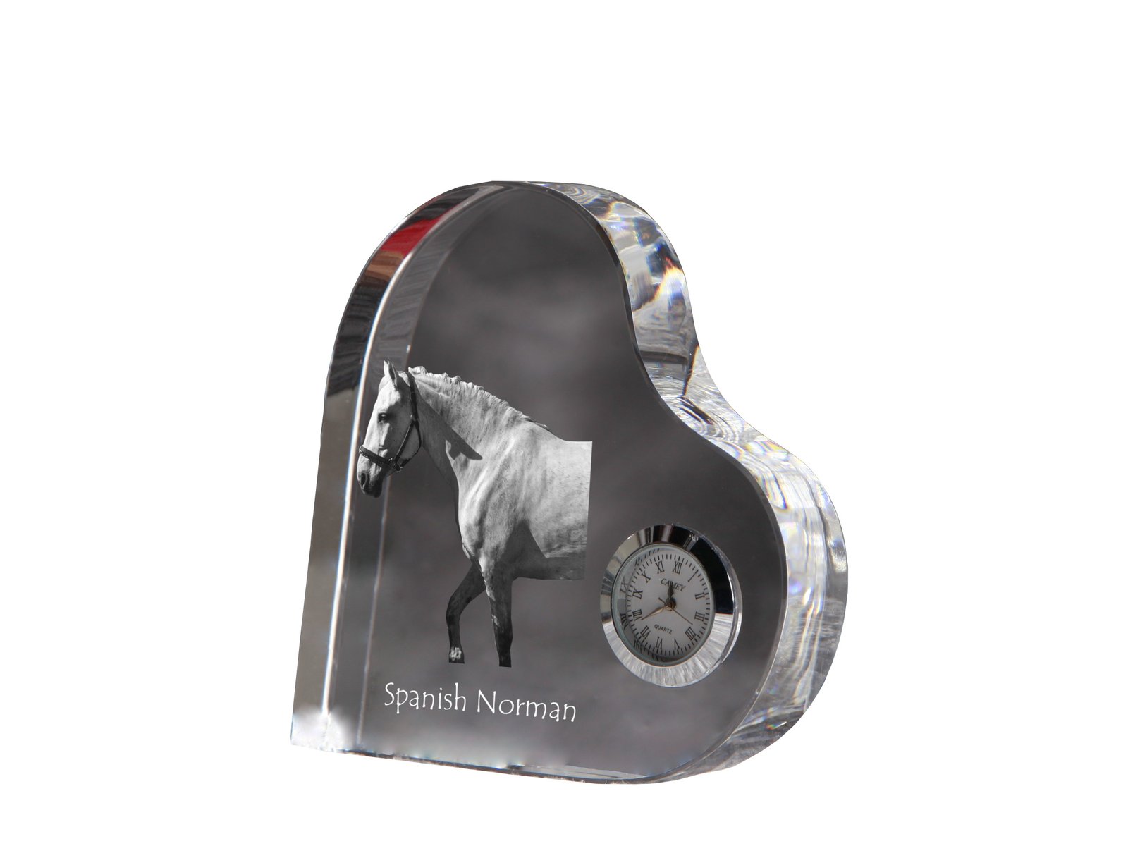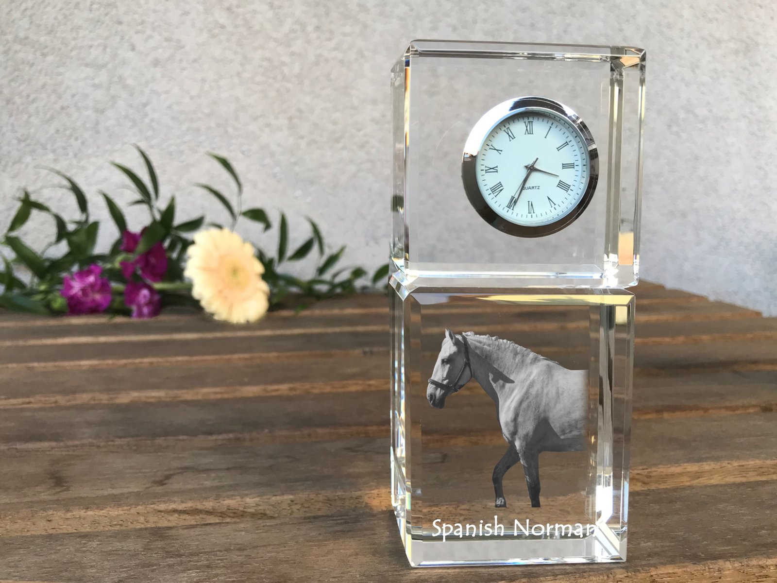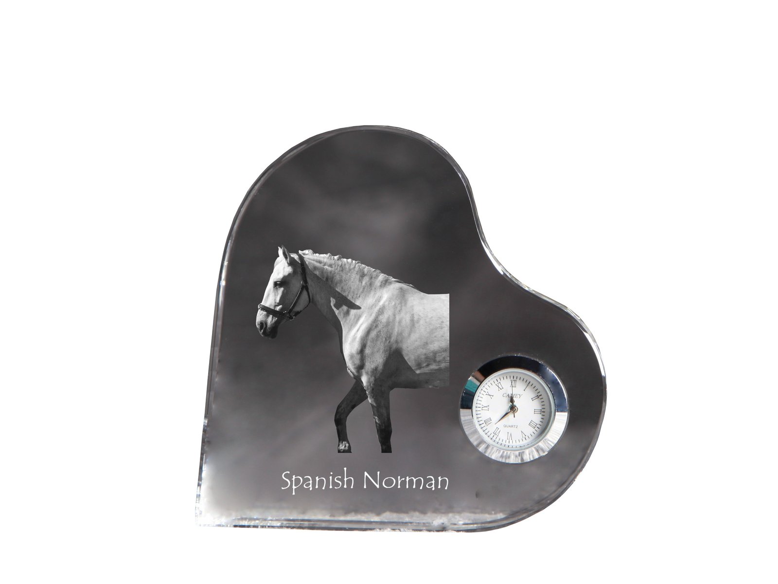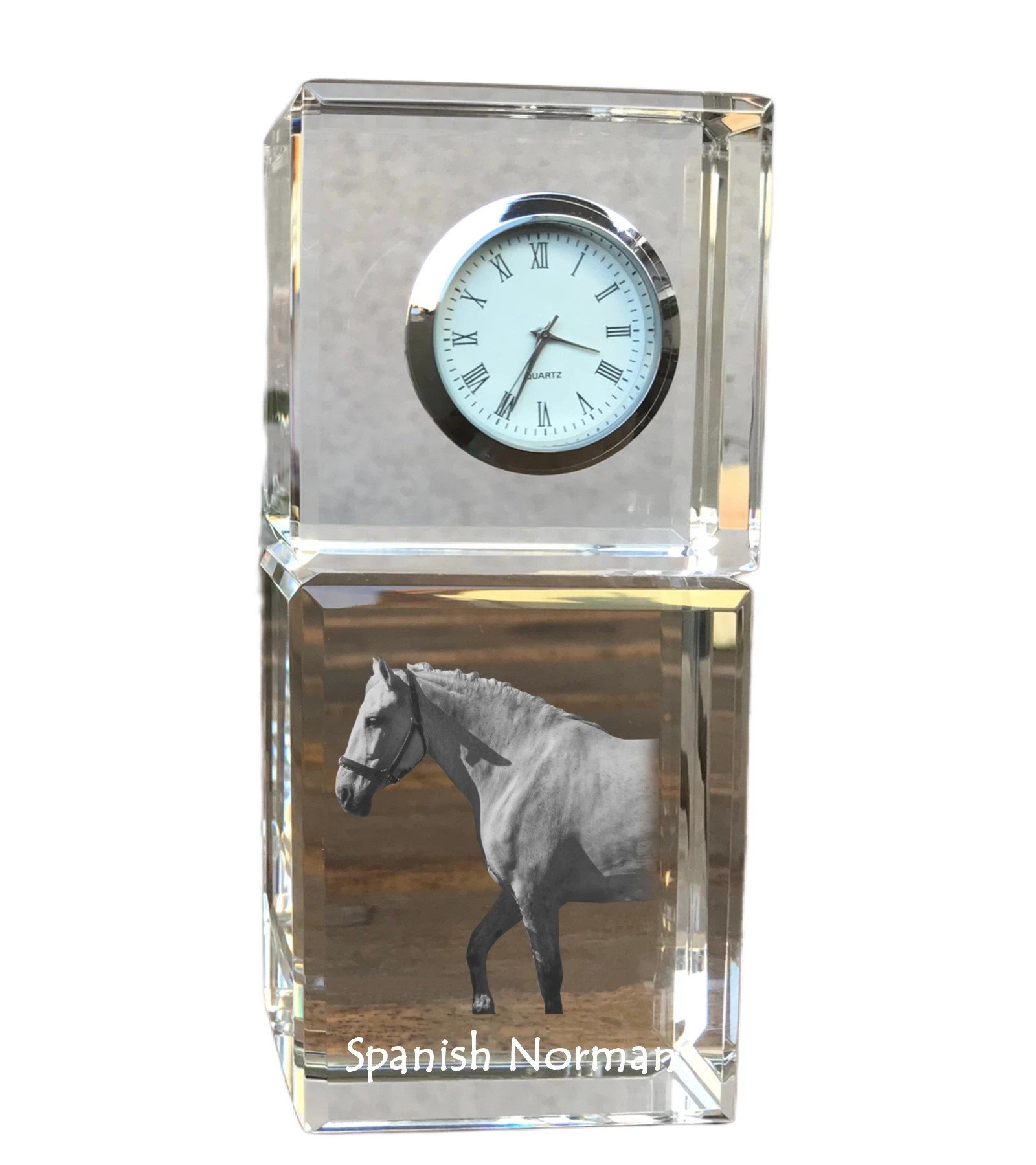 Ispanų normanų veislės arklys – Krištolo laikrodis su arklio nuotrauka