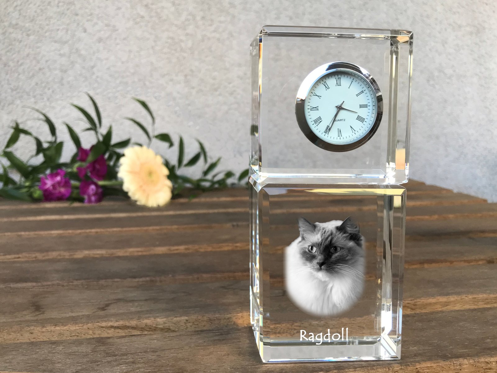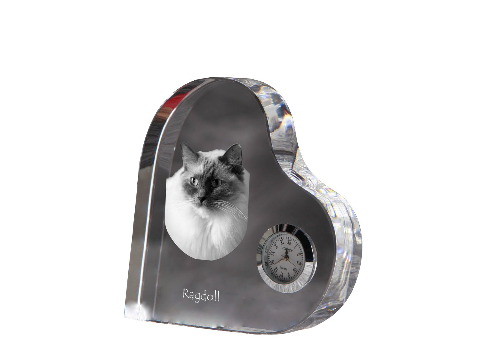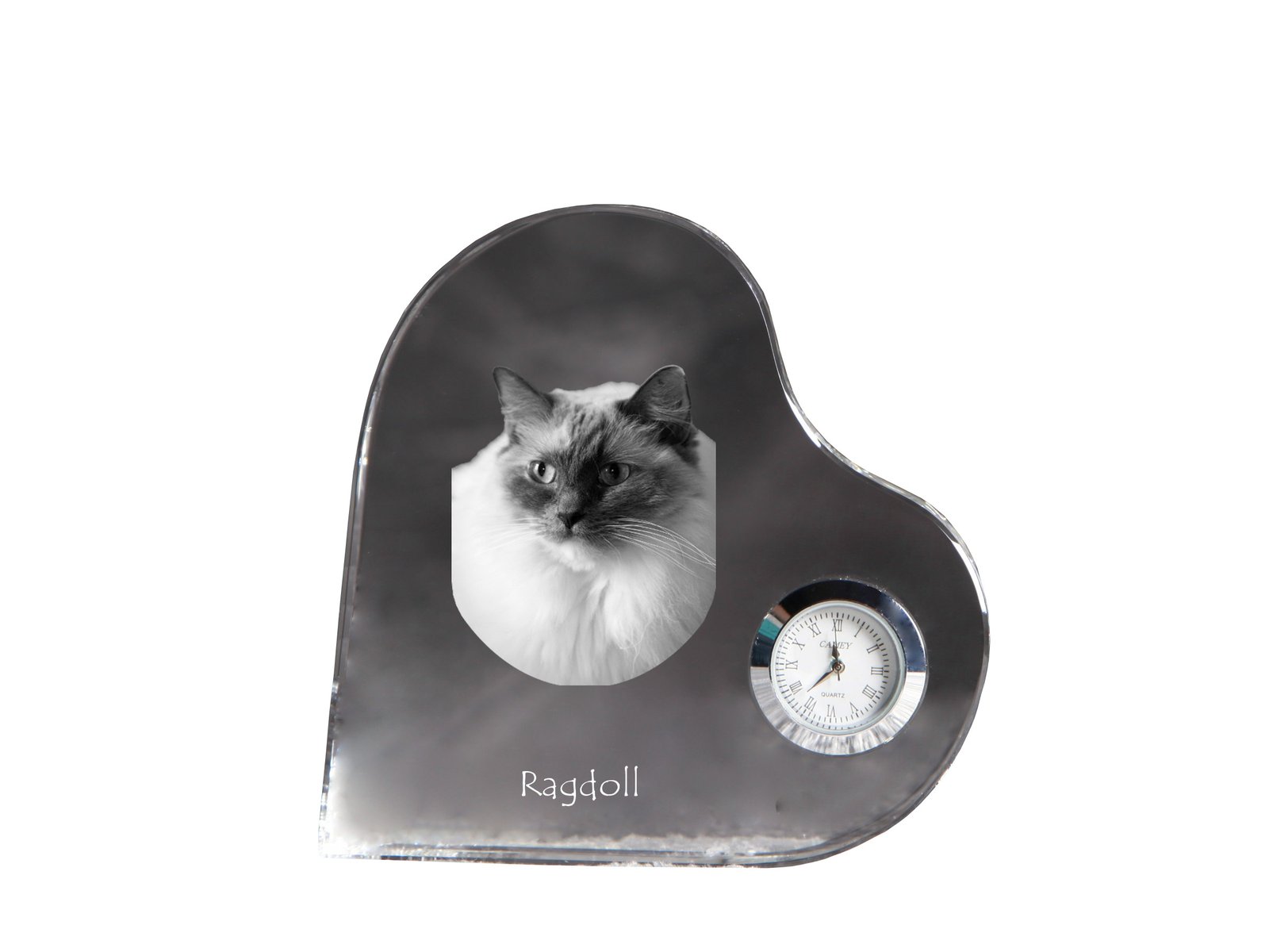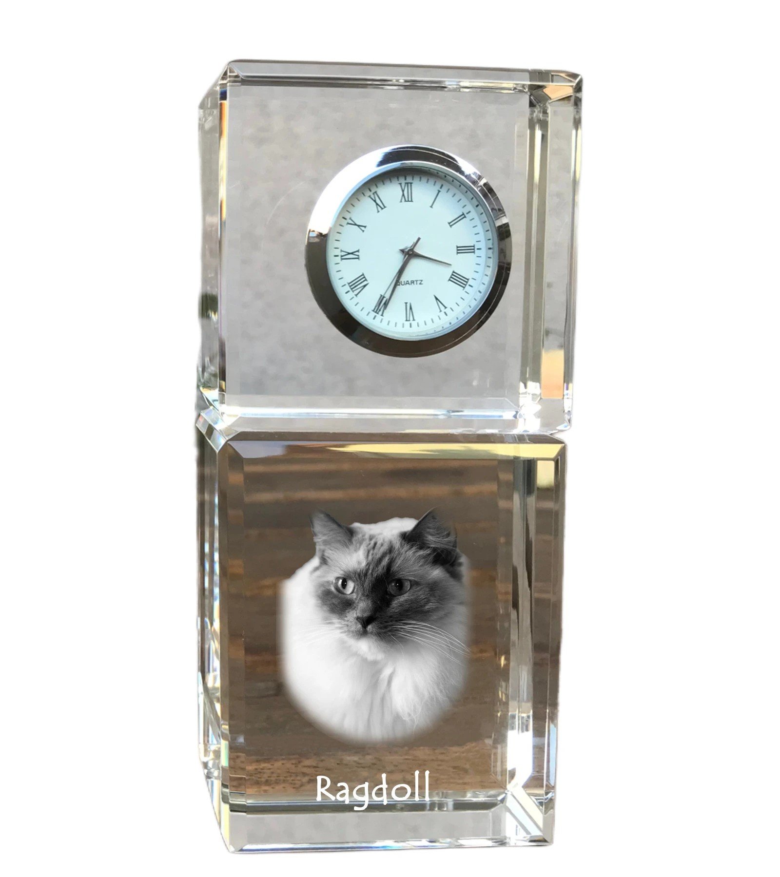 Ragdoll katės (Skudurinukė, Ragdoll) – Krištolo laikrodis su katės nuotrauka