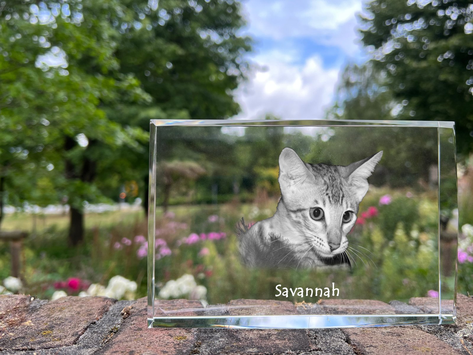 Savanos katė (Savannah cat) – Atminimo lenta su katės nuotrauka