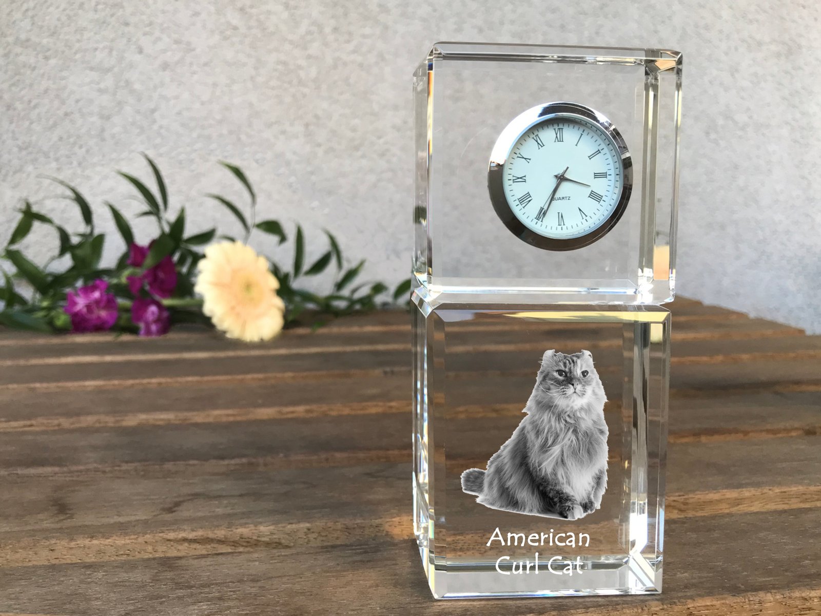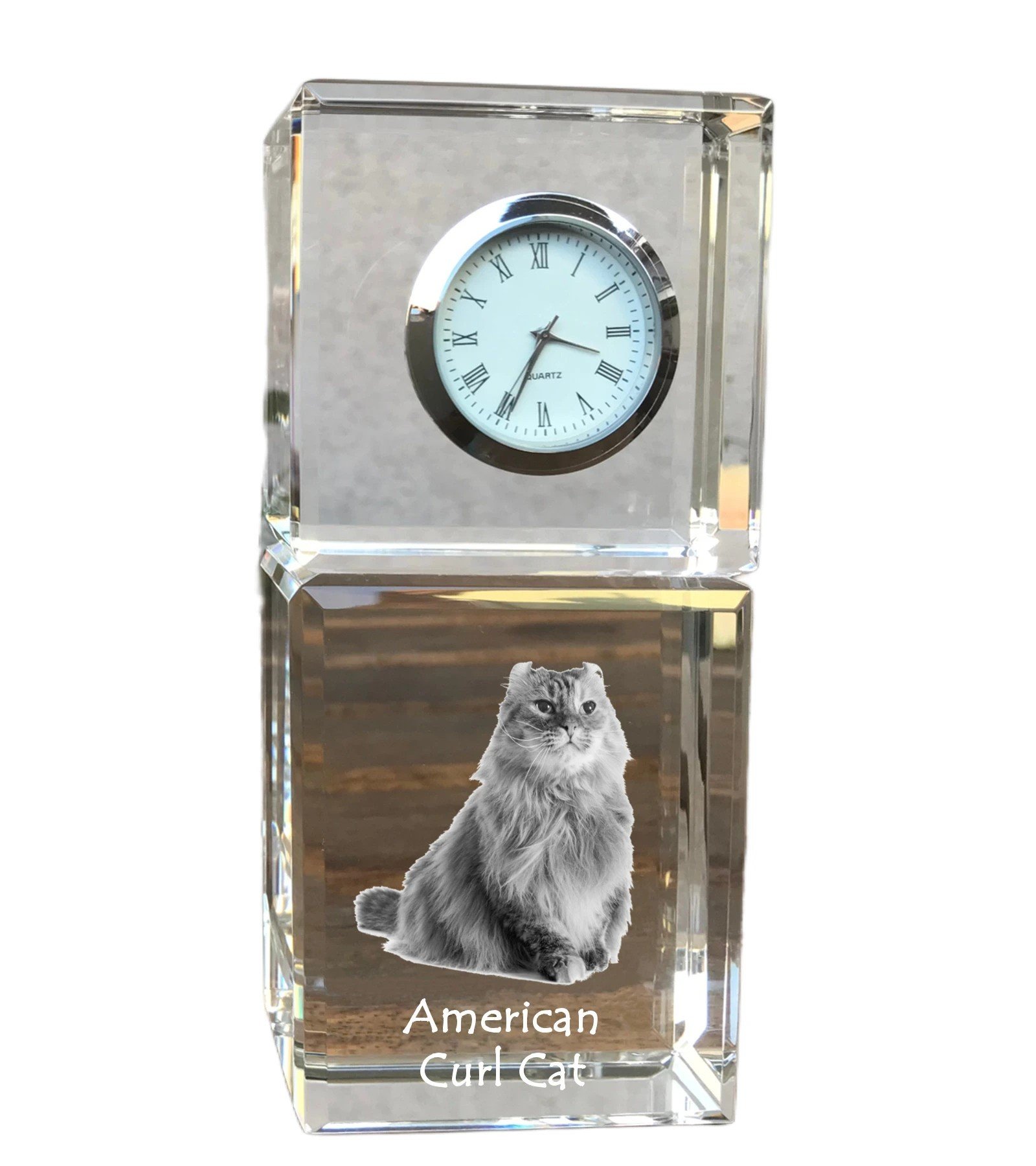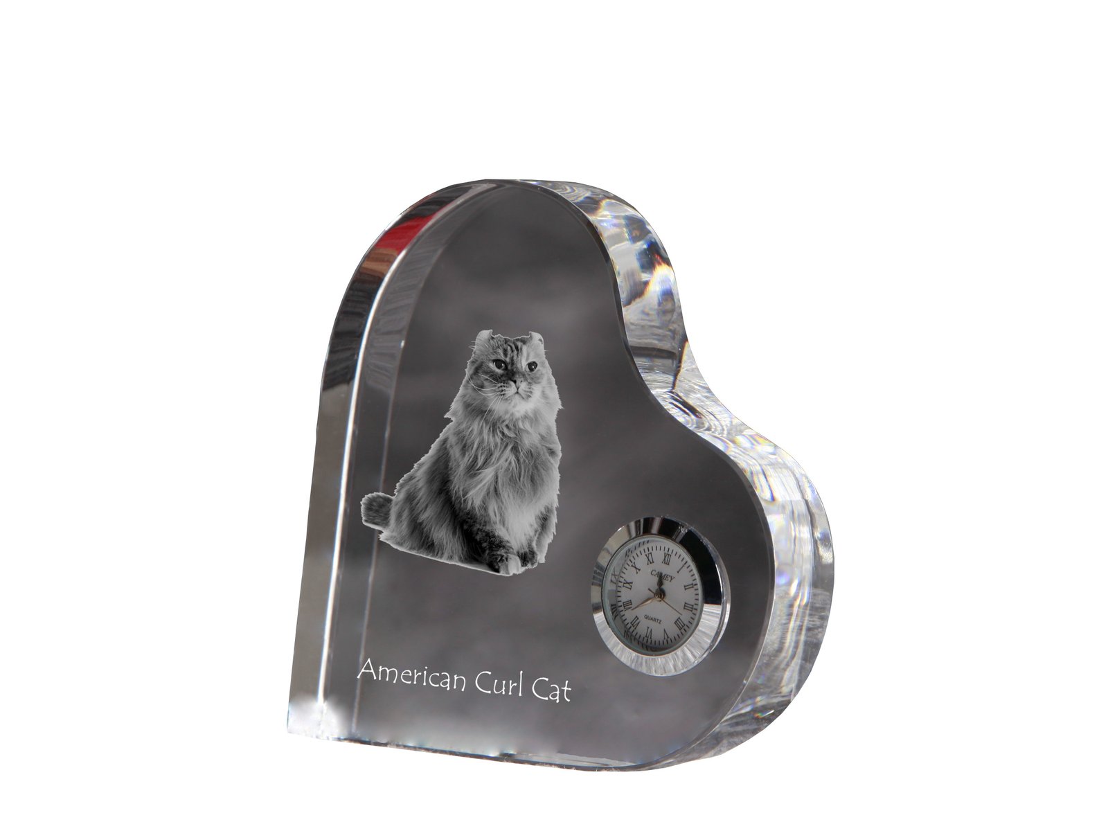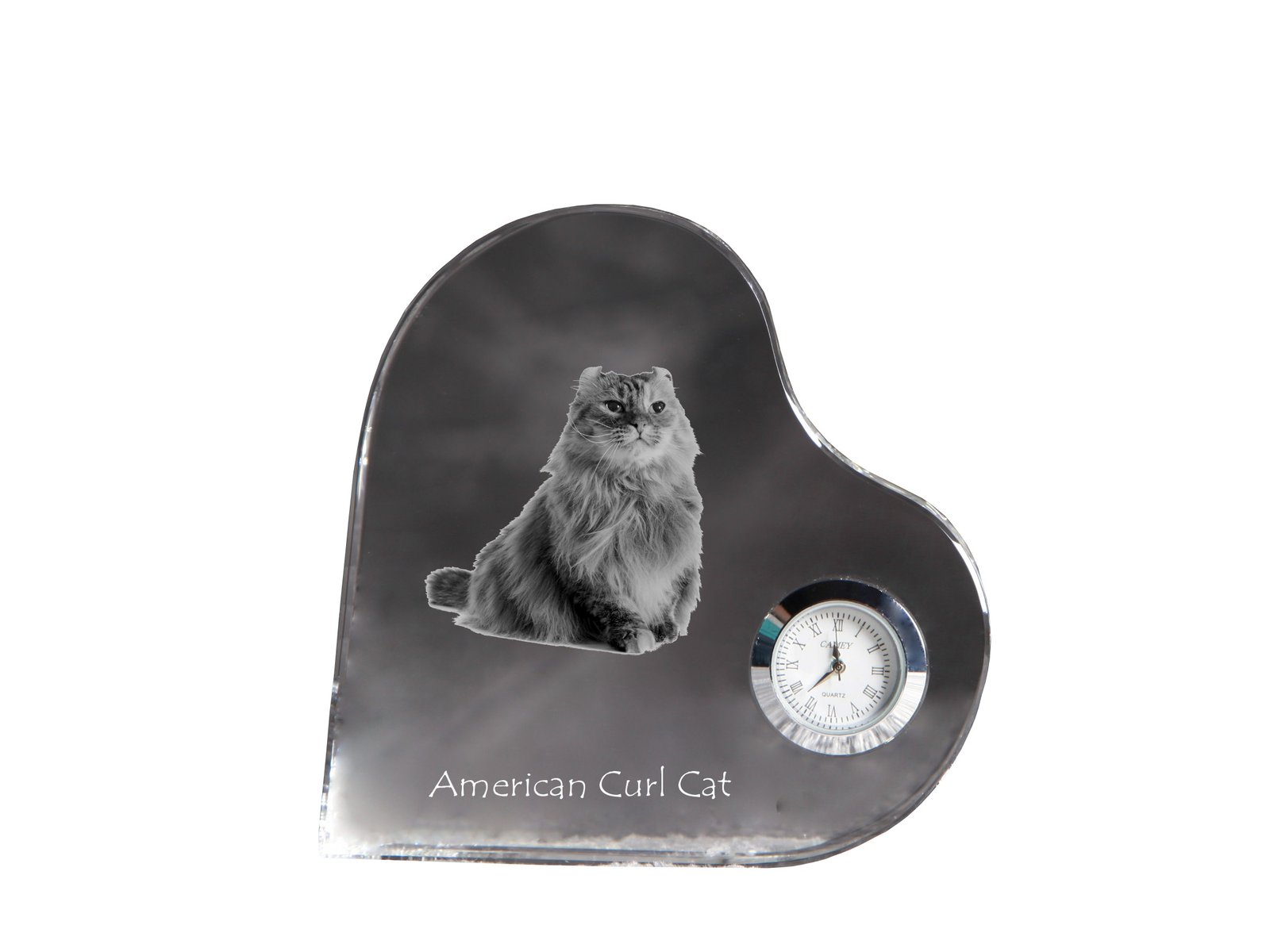 Amerikos garbanė (American Curl) – Krištolo laikrodis su katės nuotrauka