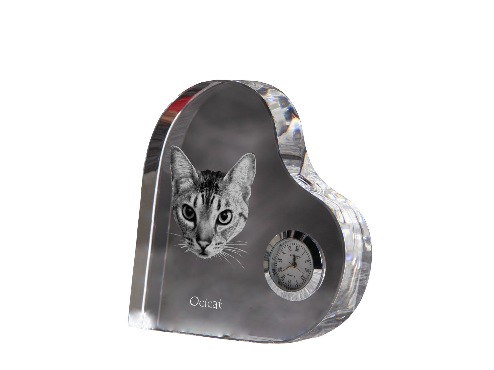 Oksikat katės (Ocicat) – Krištolo laikrodis su katės nuotrauka