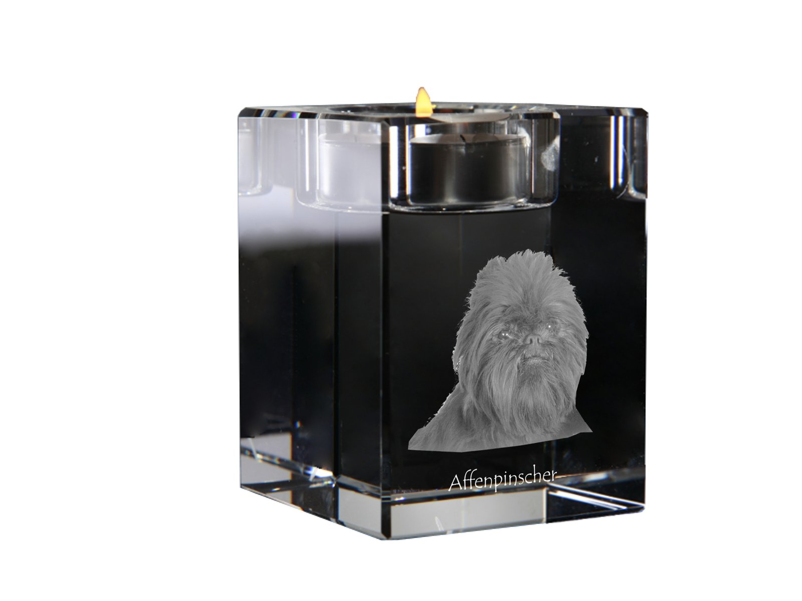 Norėtume pasiūlyti neįprastą jūsų namų puošmeną – graviruotą krištolą su jūsų mėgstamo augintinio atvaizdu. Rinkitės iš daugybės siūlomų šunų, kačių ir arklių veislių arba atsiųskite mums savo augintinio nuotrauką. Leiskite mums nustebinti jus nepaprastu tikslumu! Šie unikalūs žvakidės laikikliai yra skaidrūs kristalai su aukštos kokybės graviravimu viduje. Krištolo matmenys yra 6×6 cm, o aukštis – 8 cm. Anga tinka tipinei arbatinei žvakei.