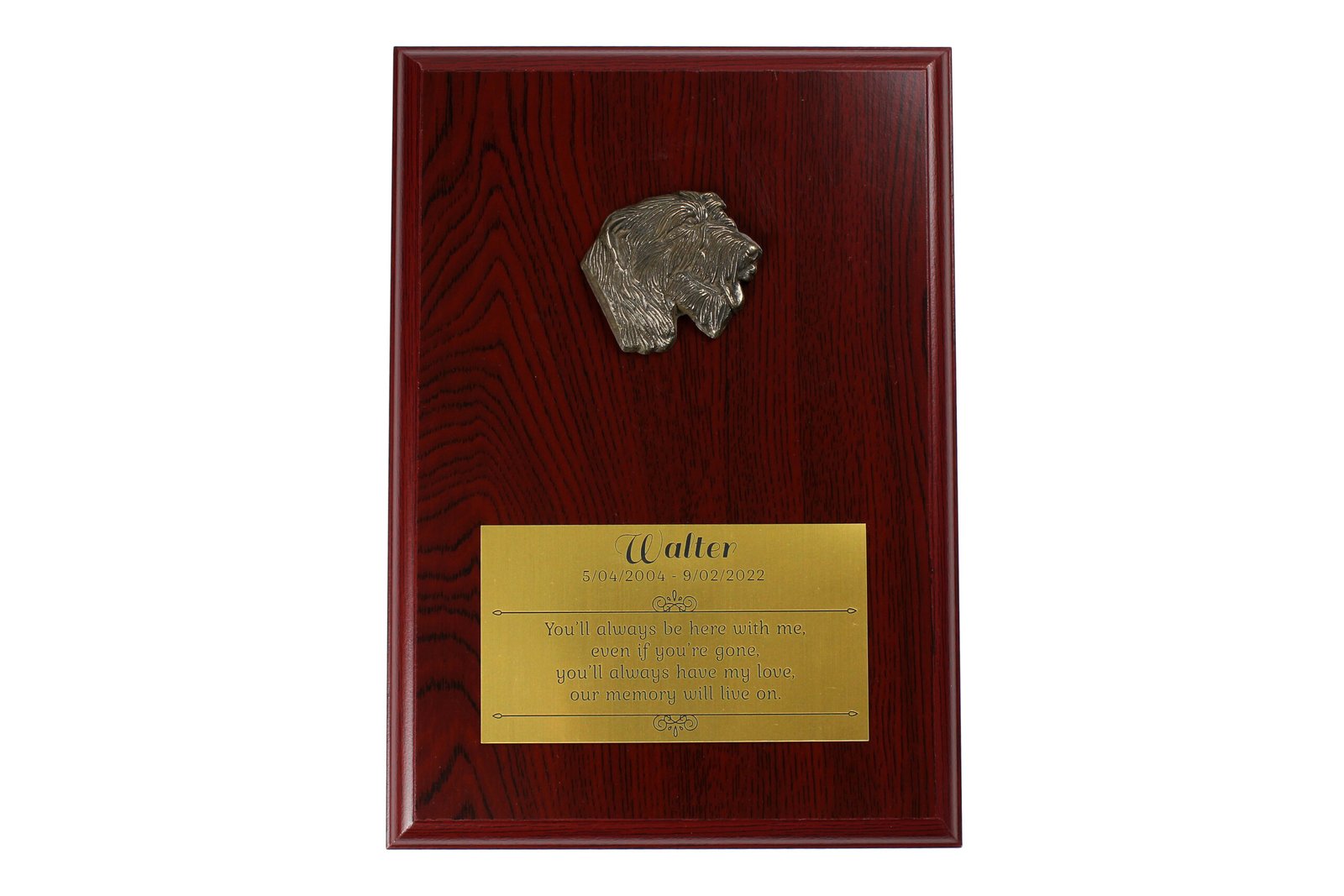 Pristatome elegantišką atminimo lentą su šuns paveikslu, idealiai tinkančią atminti Jūsų mylimo keturkojo draugo. Lenta sudaryta iš tvirto MDF pagrindo, įgraviruotoje lentelėje auksinės spalvos bei plokščiojo reljefo šuns. Lentelėje yra paruošti skylės pakabinimui ant sienos, taip pat stovas, leidžiantis ją pastatyti ant lentynos. Reljefas, kuris buvo suprojektuotas ir pagamintas Lenkijoje, ištikimai atspindi pasirinktos veislės charakteringas savybes, todėl yra ypatingai realistiškas.