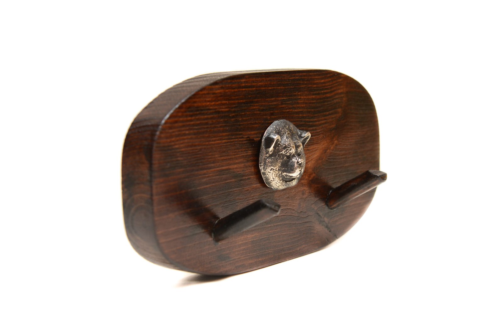 Ši medinė šunų pakaba – tai rankų darbo unikalus aksesuaras, skirtas interjerui suteikti ir funkcionalumo, ir elegancijos. Klasikinį stilių atspindi pušies medienos ir pasidabruoto, sudėtingai pagaminto šuns reljefo derinys. Pakabą galima naudoti kaip tradicinę drabužių kabyklą, taip pat kaip pavadėlio ir kitų šuns aksesuarų pakabą, parodoje iškovotų medalių eksponatą arba kaip raktų kabliuką. Universali jos paskirtis kalba pati už save – tai bus tikrai praktiška dovana bet kuriam šunų mylėtojui!