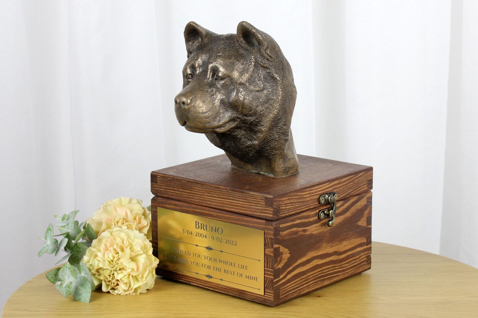 Pagrindinis urnos elementas yra gražiai pagaminta šalto lietaus bronzos šuo. Toks medžiagų derinys užtikrina ilgaamžiškumą ir amžiną grožį. Prašome būti labai atsargiems atidarant urną – statulėlė, pritvirtinta prie jos dangčio, yra sunkesnė nei dėžutė. Ją reikia tvirtai laikyti atidarant konteinerį, kad jos nepaleistumėte ir nepažeistumėte.