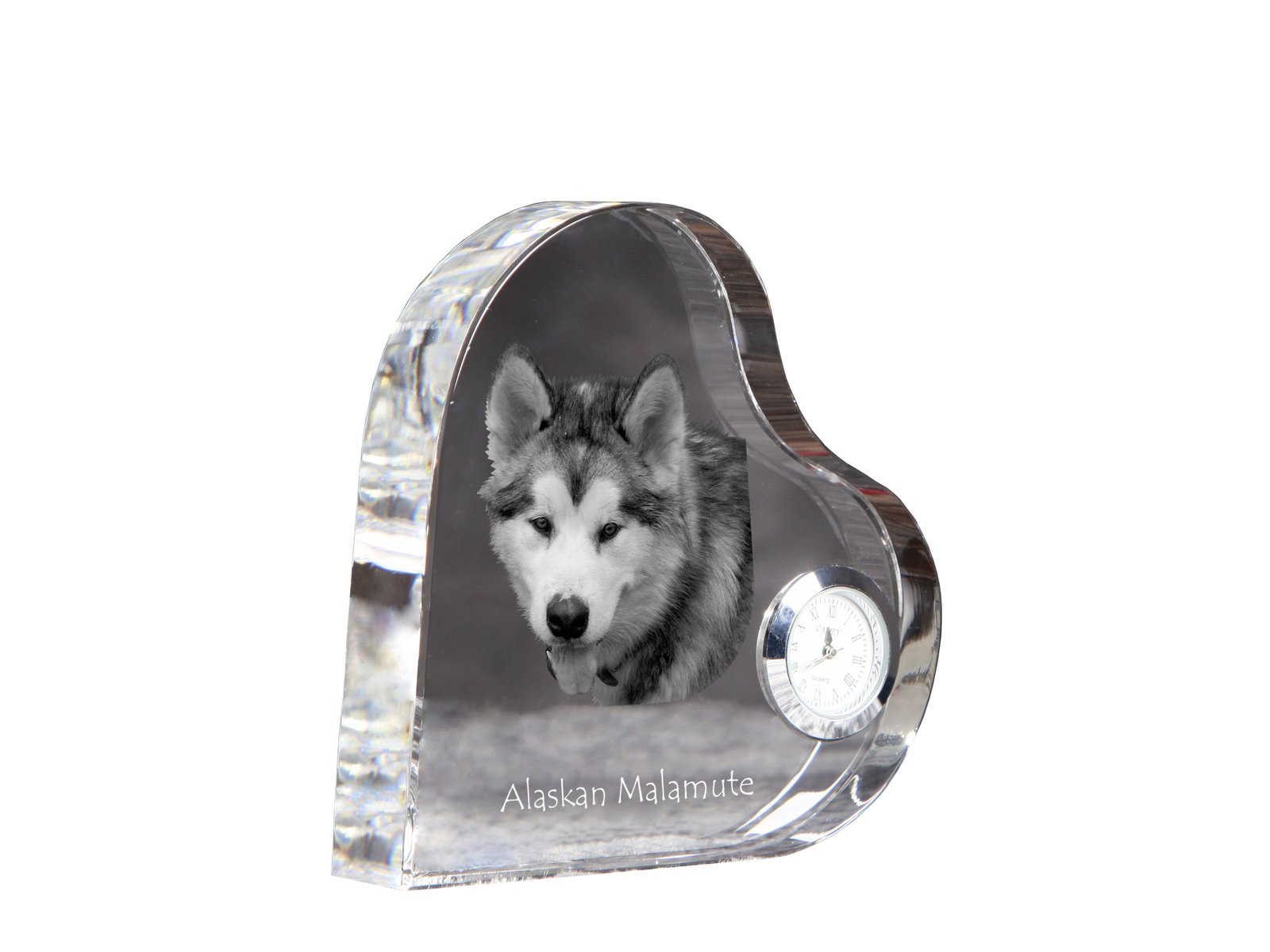 Pradžia Šunims Aliaskos malamutas (Alaskan Malamute) – Krištolo laikrodis su nuotrauka