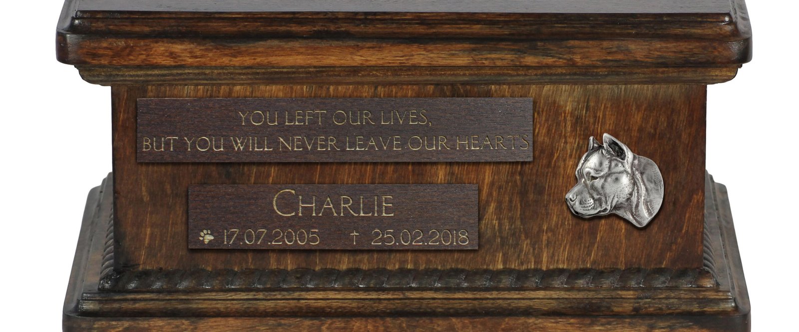 Ši rankų darbo, medinė urna pasižymi aukštu estetika ir klasikiniu dizainu. Indas papuoštas mediniu vainiku, turi patogius varinius rankenos. Ant dangčio centriniame taške tvirtai pritvirtinta unikali statulėlė iš kolekcijos. Šuns figūra atspindi veislės išvaizdos charakteringas savybes. Dangtį lengvai nuimti, kad būtų galima įdėti pelenus į vidų.