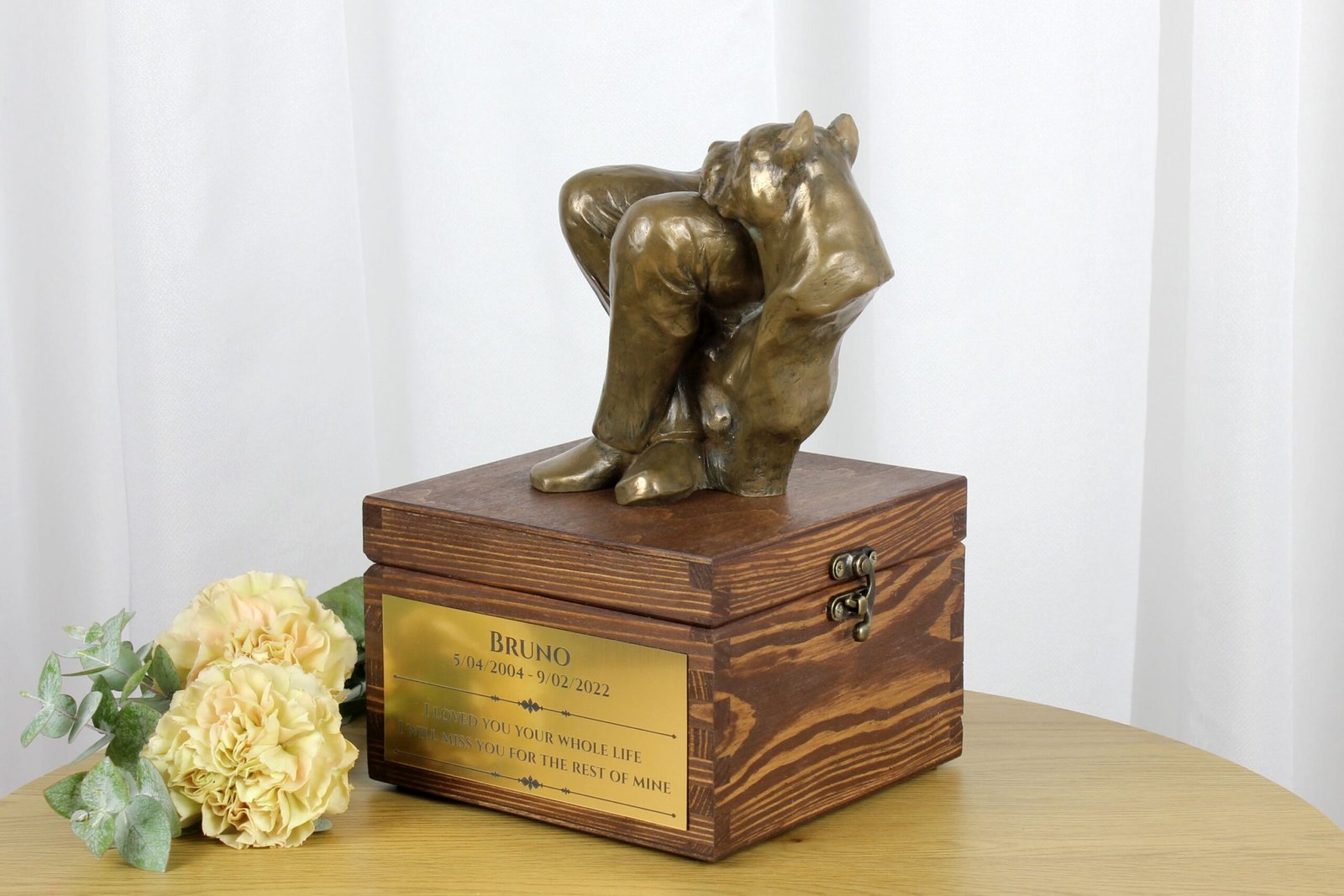 Medinė urna, pagaminta iš pušies medžio, turi elegantišką užsegimą ir auksinį antspaudą su juodu graviravimu. Svarbus elementas čia yra personalizacija – pateikite mums savo augintinio vardą, gimimo ir mirties datą bei pasirinktą citatą, o mes jas išgraviruosime, padarant šią urną unikalią. Urnos apačia apsaugota vilnoniais žiedais, kad būtų išvengta baldų įbrėžimų perkeldžiant.
