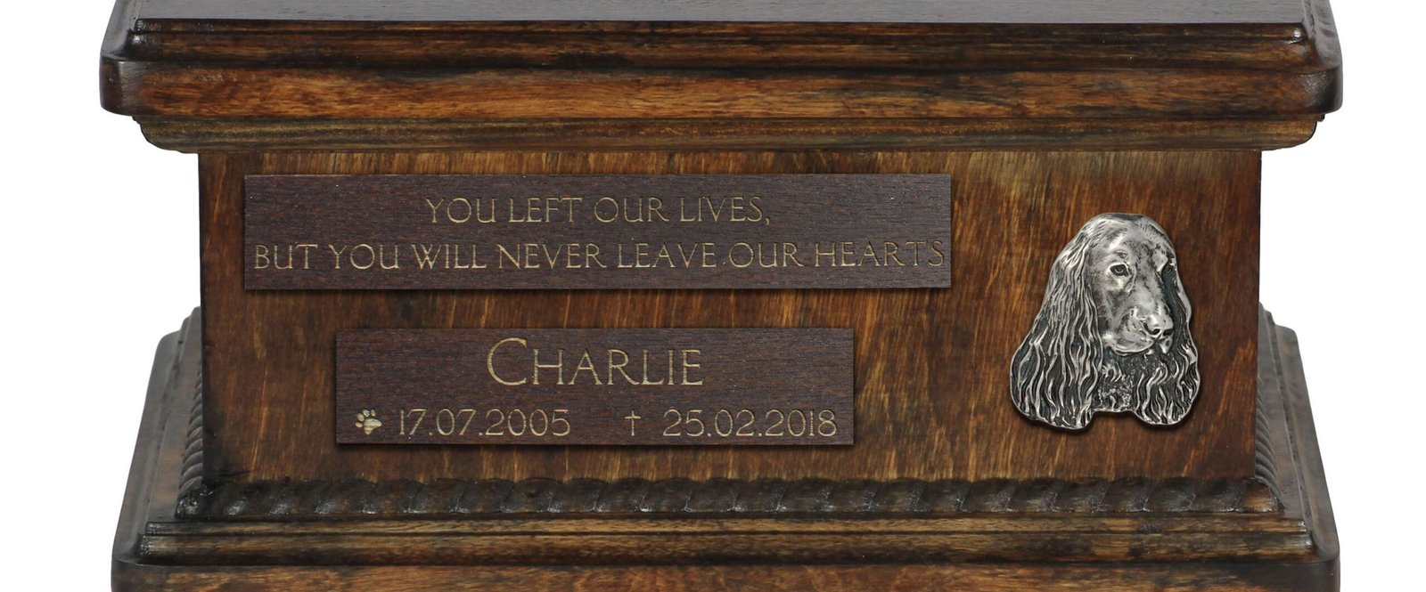 Ši unikali urna yra suprojektuota taip, kad galėtumėte ją pritaikyti asmeniškai. Ant priekinės matomos medinės lentelės įgraviruosime jūsų pateiktus detalus, tokius kaip šuns vardas, gimimo ir mirties data bei citata. Estetiškas sidabrinis emblemas su veislės atvaizdu puošia kompoziciją.