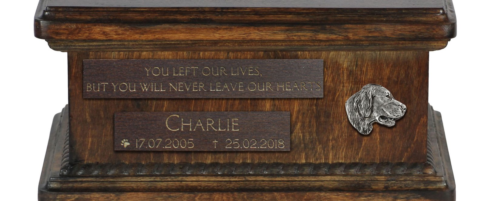 Ši unikali urna yra suprojektuota taip, kad galėtumėte ją pritaikyti asmeniškai. Ant priekinės matomos medinės lentelės įgraviruosime jūsų pateiktus detalus, tokius kaip šuns vardas, gimimo ir mirties data bei citata. Estetiškas sidabrinis emblemas su veislės atvaizdu puošia kompoziciją.