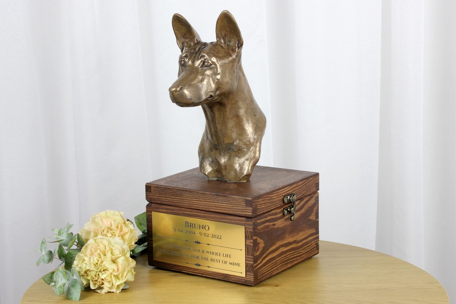 Pagrindinis urnos elementas yra gražiai pagaminta šalto lietaus bronzos šuo. Toks medžiagų derinys užtikrina ilgaamžiškumą ir amžiną grožį. Prašome būti labai atsargiems atidarant urną – statulėlė, pritvirtinta prie jos dangčio, yra sunkesnė nei dėžutė. Ją reikia tvirtai laikyti atidarant konteinerį, kad jos nepaleistumėte ir nepažeistumėte.
