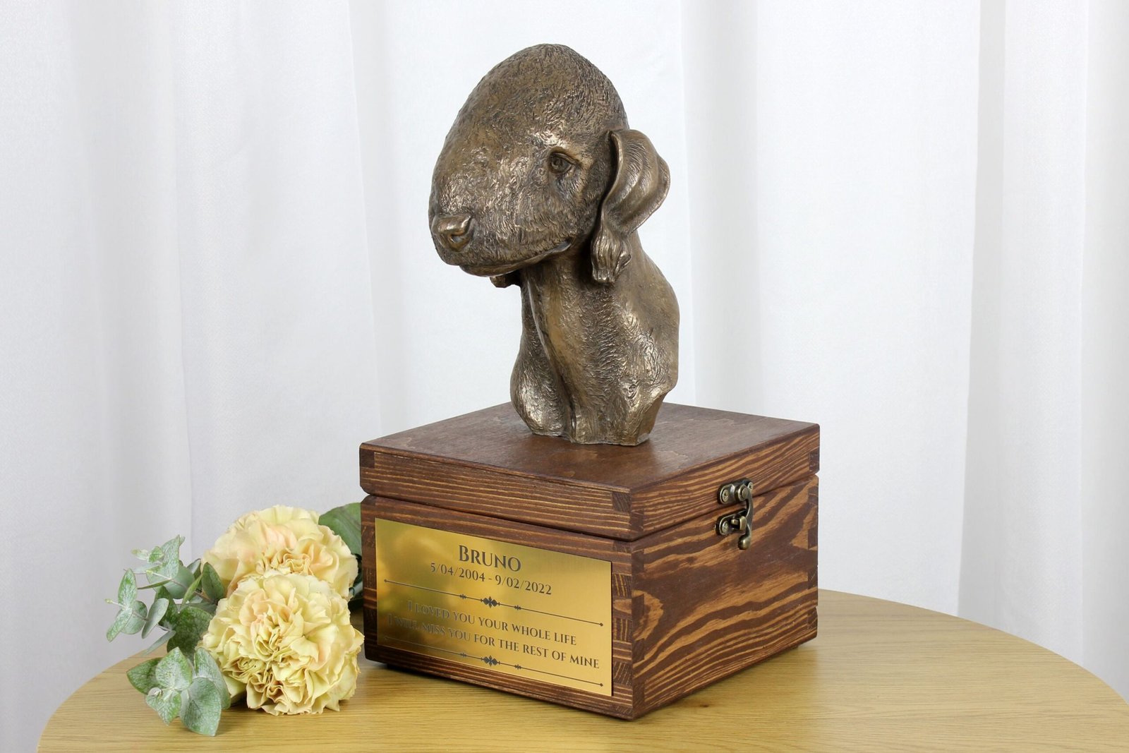 Pagrindinis urnos elementas yra gražiai pagaminta šalto lietaus bronzos šuo. Toks medžiagų derinys užtikrina ilgaamžiškumą ir amžiną grožį. Prašome būti labai atsargiems atidarant urną – statulėlė, pritvirtinta prie jos dangčio, yra sunkesnė nei dėžutė. Ją reikia tvirtai laikyti atidarant konteinerį, kad jos nepaleistumėte ir nepažeistumėte.