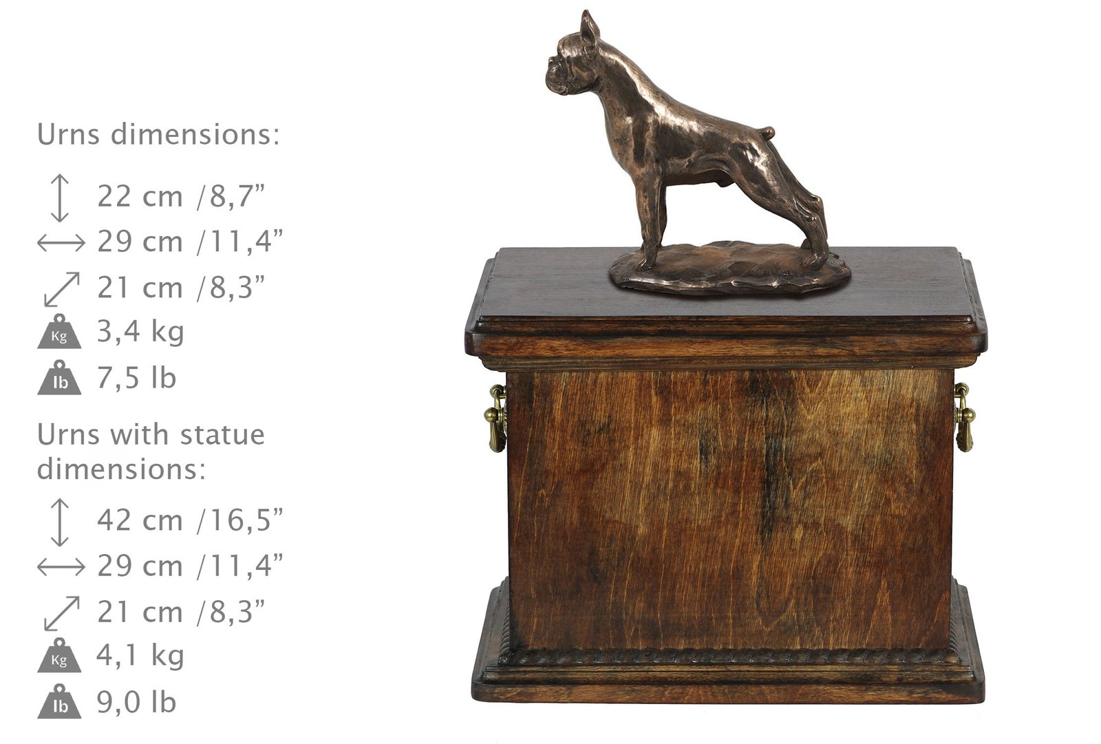 Medžio ir unikalių statulėlių junginys suteikia ypatingą eleganciją ir sukuria šią urną puikiu vienuoliu tavo augintiniui.