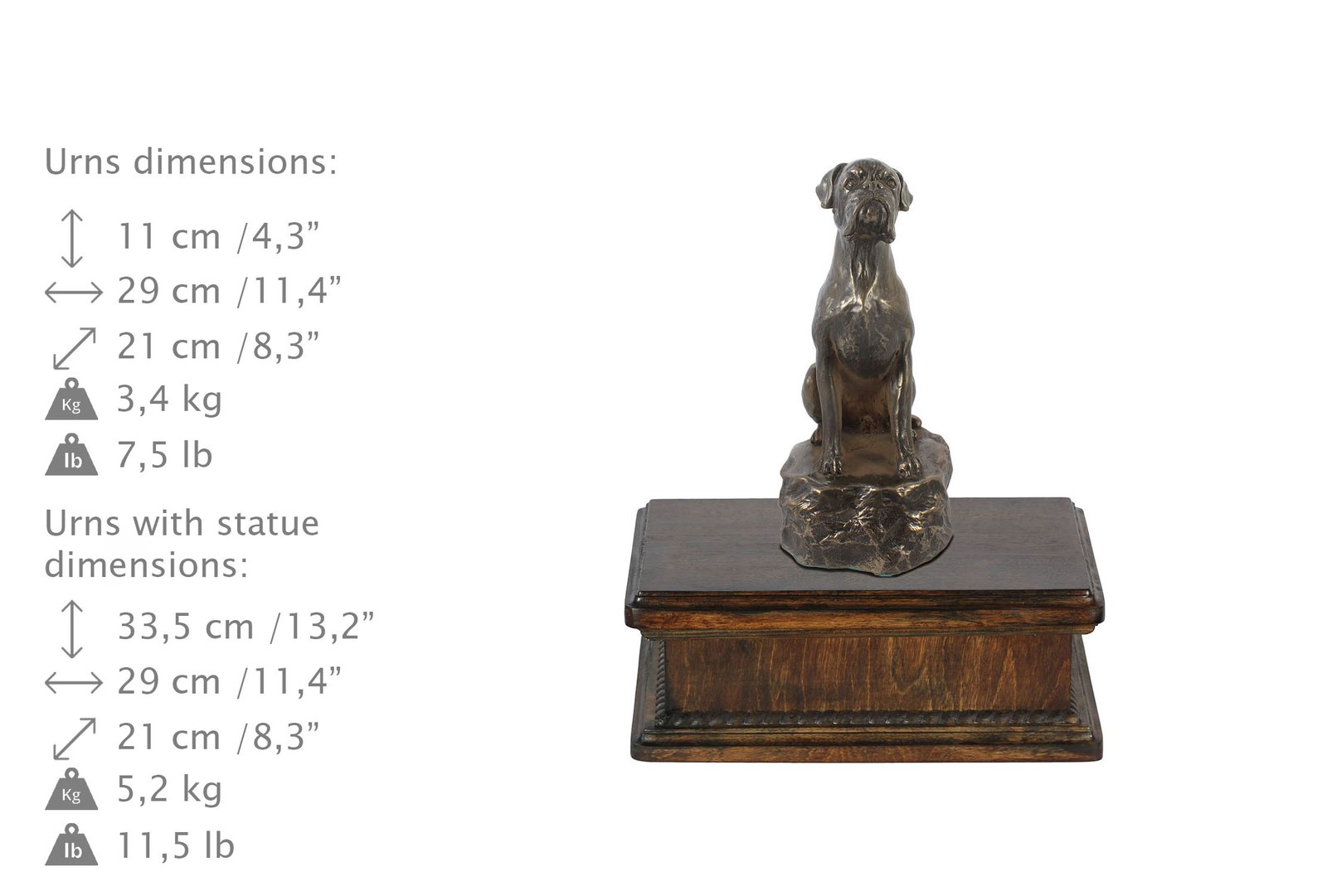 Ši rankų darbo, medinė urna pasižymi aukštu estetika ir klasikiniu dizainu. Talpykla papuošta mediniu vainiku, įrengta patogiais, variniais rankenėliais. Ant dangčio centriniame taške tvirtai pritvirtinta išskirtinė kolekcijos statulėlė. Šuns figūra atspindi rūšies išvaizdos charakteringas savybes. Dangtį lengvai nuimsite, kad galėtumėte įdėti pelenus į vidų.
