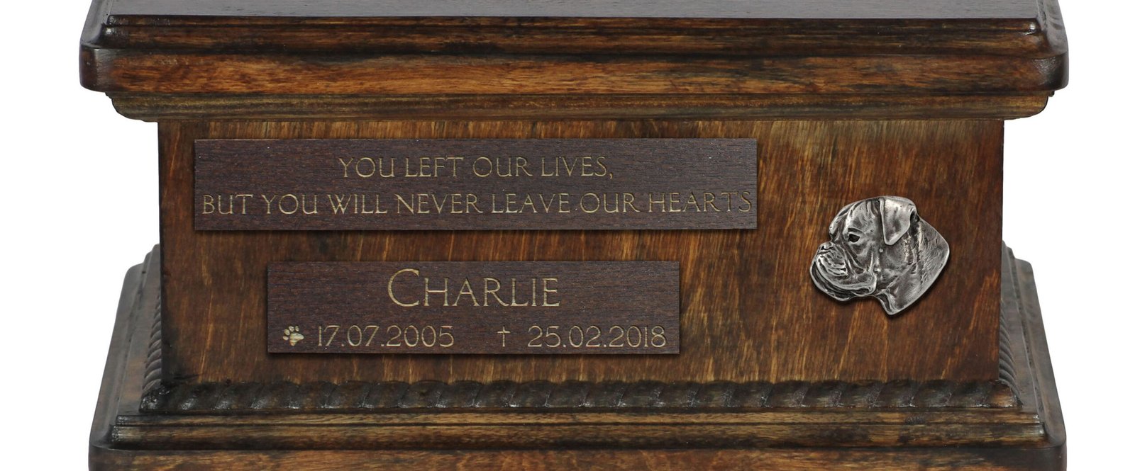 Ši rankų darbo, medinė urna pasižymi aukštu estetika ir klasikiniu dizainu. Indas papuoštas mediniu vainiku, turi patogius varinius rankenos. Ant dangčio centriniame taške tvirtai pritvirtinta unikali statulėlė iš kolekcijos. Šuns figūra atspindi veislės išvaizdos charakteringas savybes. Dangtį lengvai nuimti, kad būtų galima įdėti pelenus į vidų.