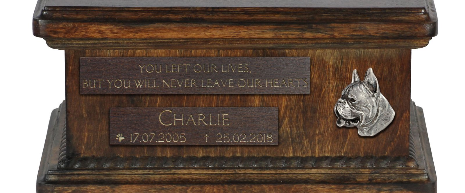 Ši unikali urna yra suprojektuota taip, kad galėtumėte ją pritaikyti asmeniškai. Ant priekinės matomos medinės lentelės įgraviruosime jūsų pateiktus detalus, tokius kaip šuns vardas, gimimo ir mirties data bei citata. Estetiškas sidabrinis emblemas su veislės atvaizdu puošia kompoziciją.