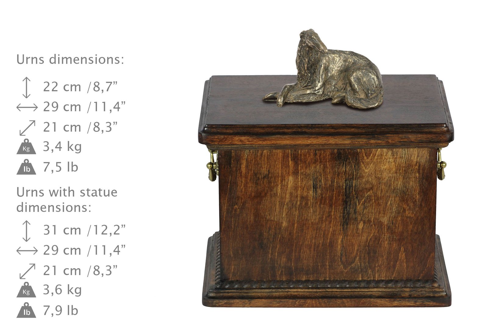 Rankų darbo beržo medžio urna puošta estetiškais vainikais, o jos centrinėje vietoje yra statulėlė su šuniuku. Figūra tvirtai pritvirtinta prie nuimamos dangčio dalies. Urna turi patogius varinius rankenos.