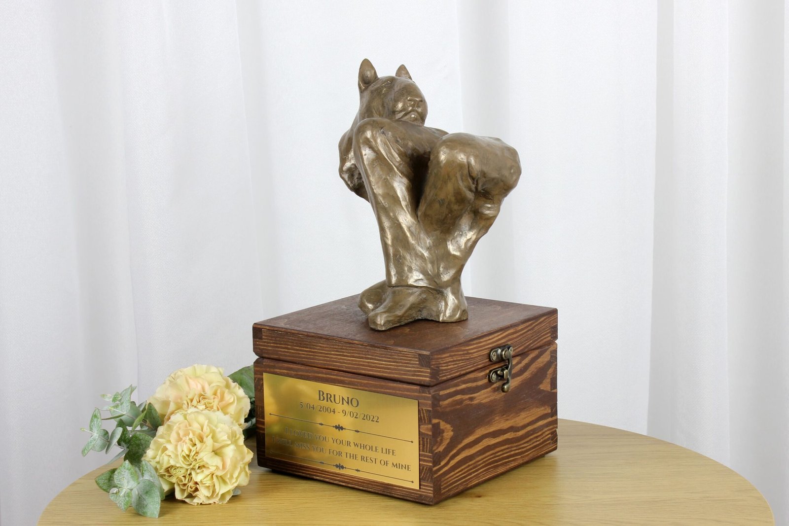 Pagrindinis urnos elementas yra gražiai pagaminta šalto lietaus bronzos šuo. Toks medžiagų derinys užtikrina ilgaamžiškumą ir amžiną grožį. Prašome būti labai atsargiems atidarant urną – statulėlė, pritvirtinta prie jos dangčio, yra sunkesnė nei dėžutė. Ją reikia tvirtai laikyti atidarant konteinerį, kad jos nepaleistumėte ir nepažeistumėte.