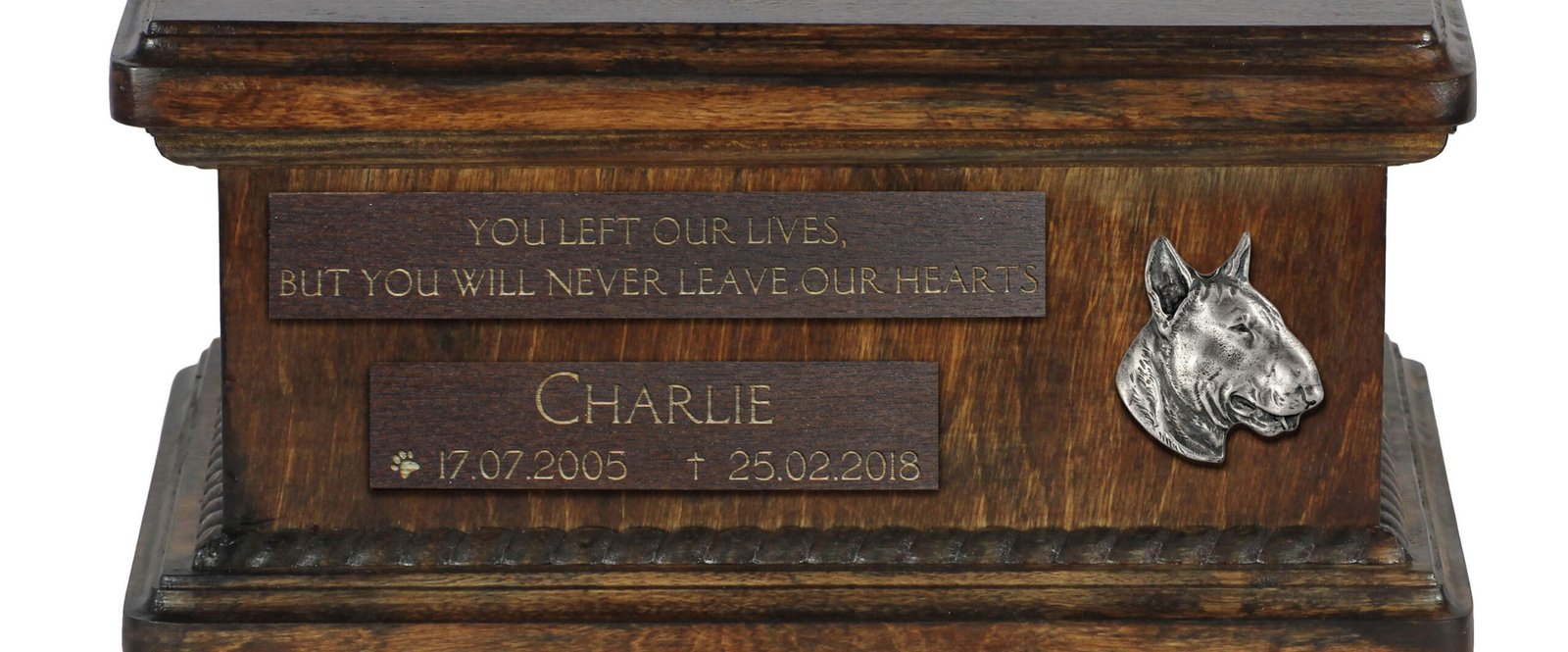 Ši unikali urna yra suprojektuota taip, kad galėtumėte ją pritaikyti asmeniškai. Ant priekinės matomos medinės lentelės įgraviruosime jūsų pateiktus detalus, tokius kaip šuns vardas, gimimo ir mirties data bei citata. Estetiškas sidabrinis emblemas su veislės atvaizdu puošia kompoziciją.