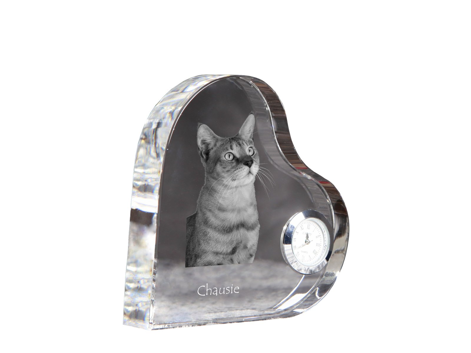 Čosio katė (Chausie cat) – Krištolo laikrodis su katės nuotrauka