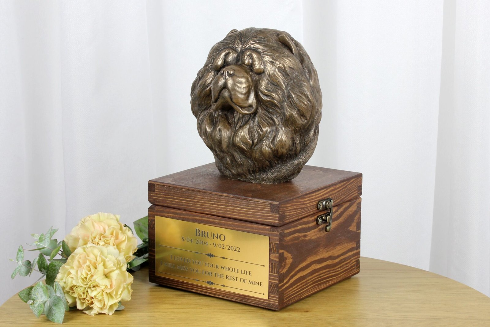 Pagrindinis urnos elementas yra gražiai pagaminta šalto lietaus bronzos šuo. Toks medžiagų derinys užtikrina ilgaamžiškumą ir amžiną grožį. Prašome būti labai atsargiems atidarant urną – statulėlė, pritvirtinta prie jos dangčio, yra sunkesnė nei dėžutė. Ją reikia tvirtai laikyti atidarant konteinerį, kad jos nepaleistumėte ir nepažeistumėte.