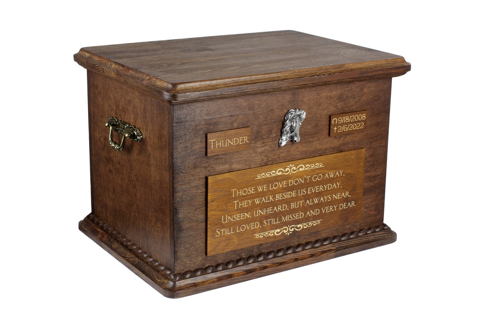 Urna iš beržo medžio yra tvirta. Ji turi varinę rankenėlę, nuimamą dangtelį ir vainiką primenančias dekoracijas. Dangtis neturi užrakto ar sandariklio. Norint tvirtai uždaryti urną, reikia priklijuoti dangtelį. Sidabrinis arklio atvaizdas yra atliktas labai kruopščiai, atspindintis charakteringus detales tam tikrai veislės.