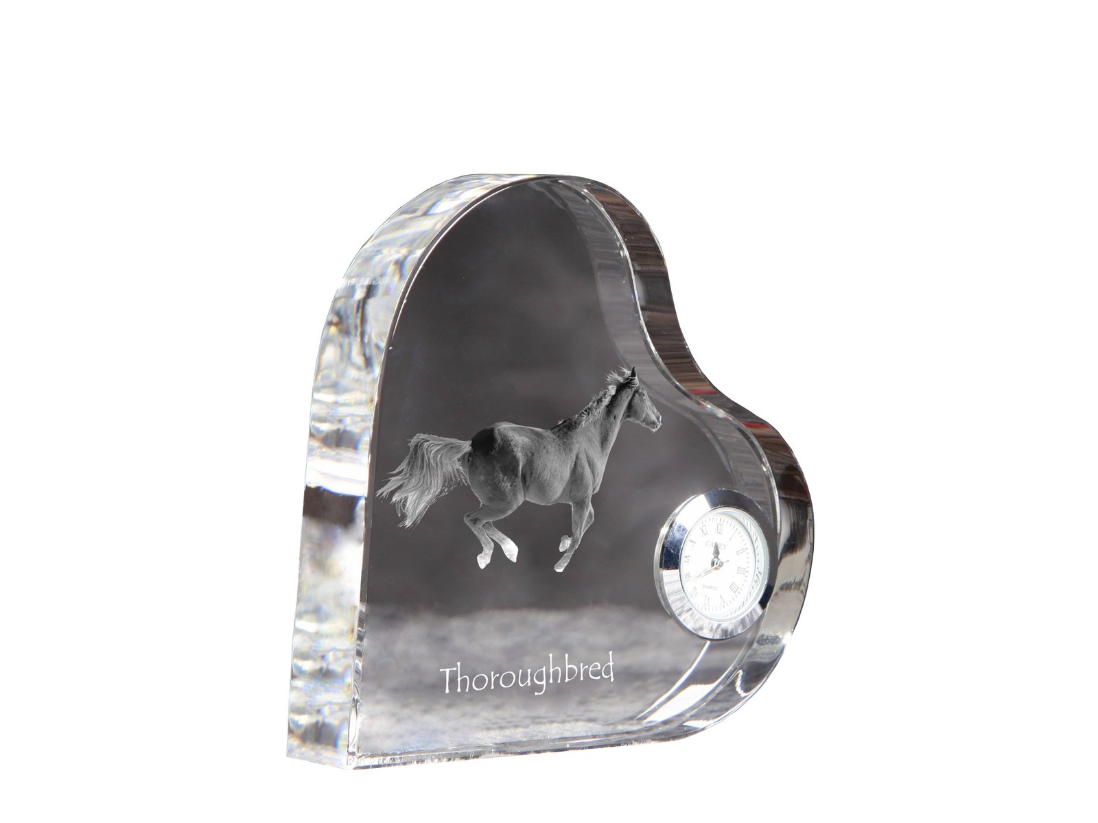 Pradžia Gyvūnams Arkliams Anglų grynakraujis (Thoroughbred) – Krištolo laikrodis su arklio nuotrauka