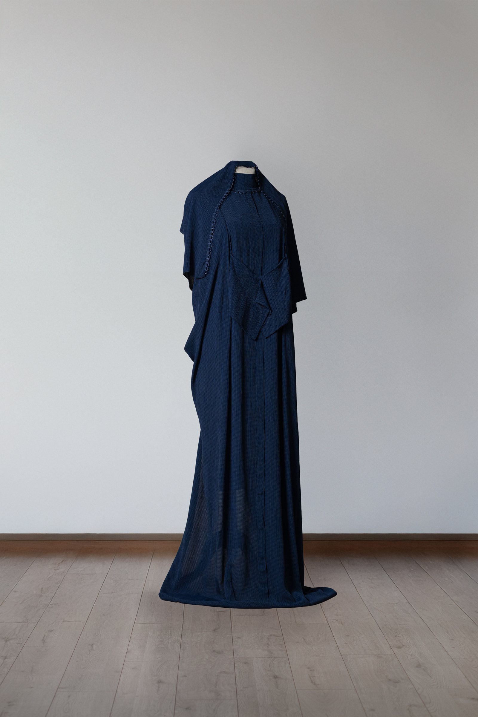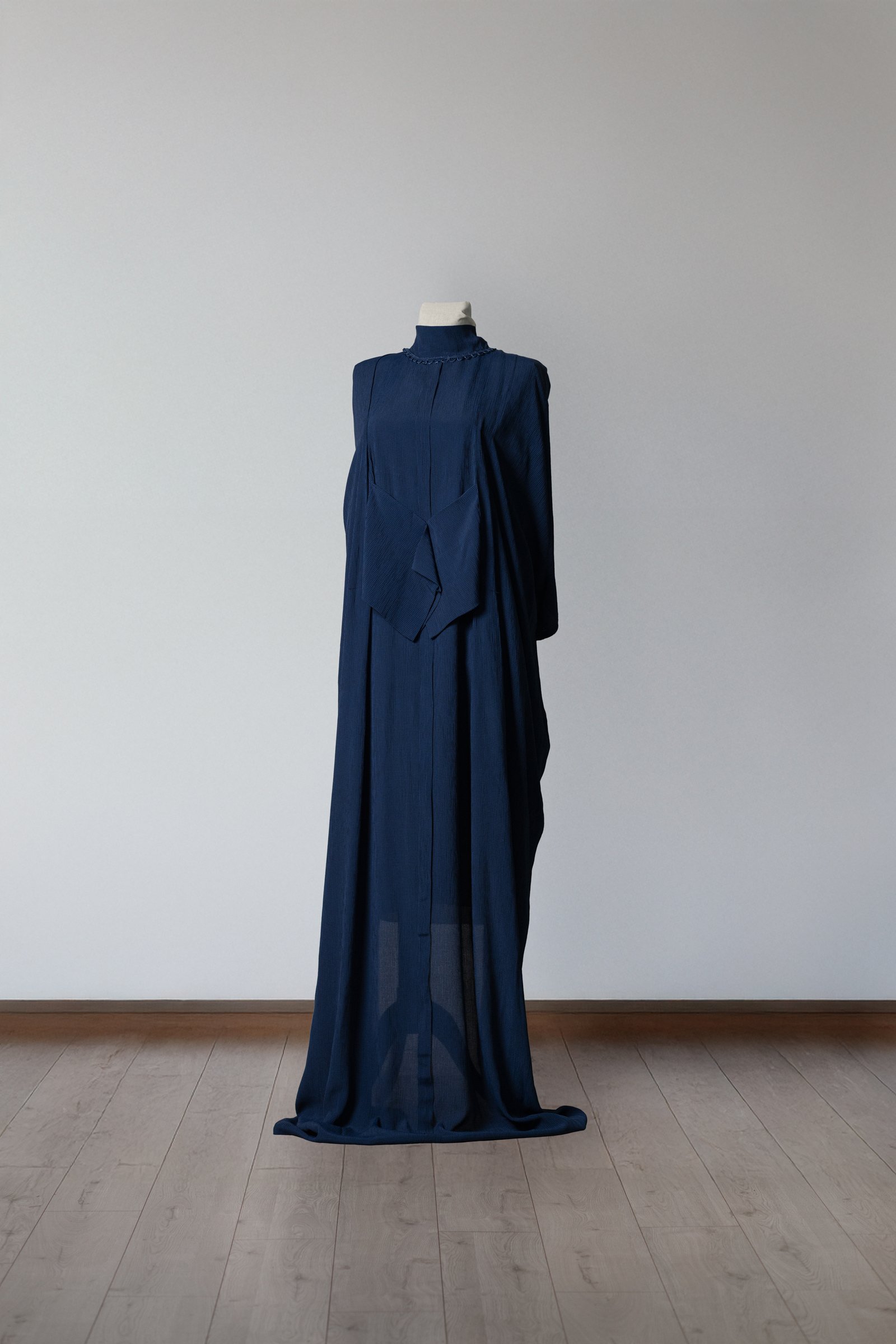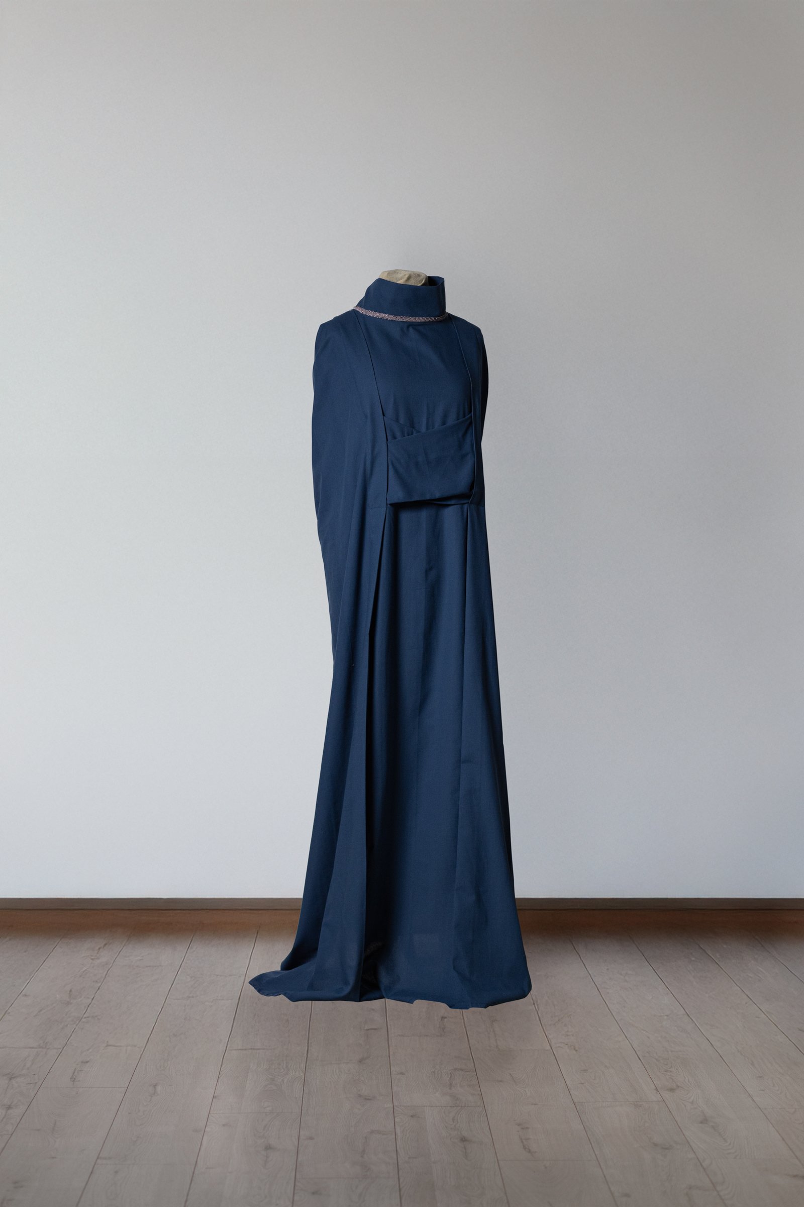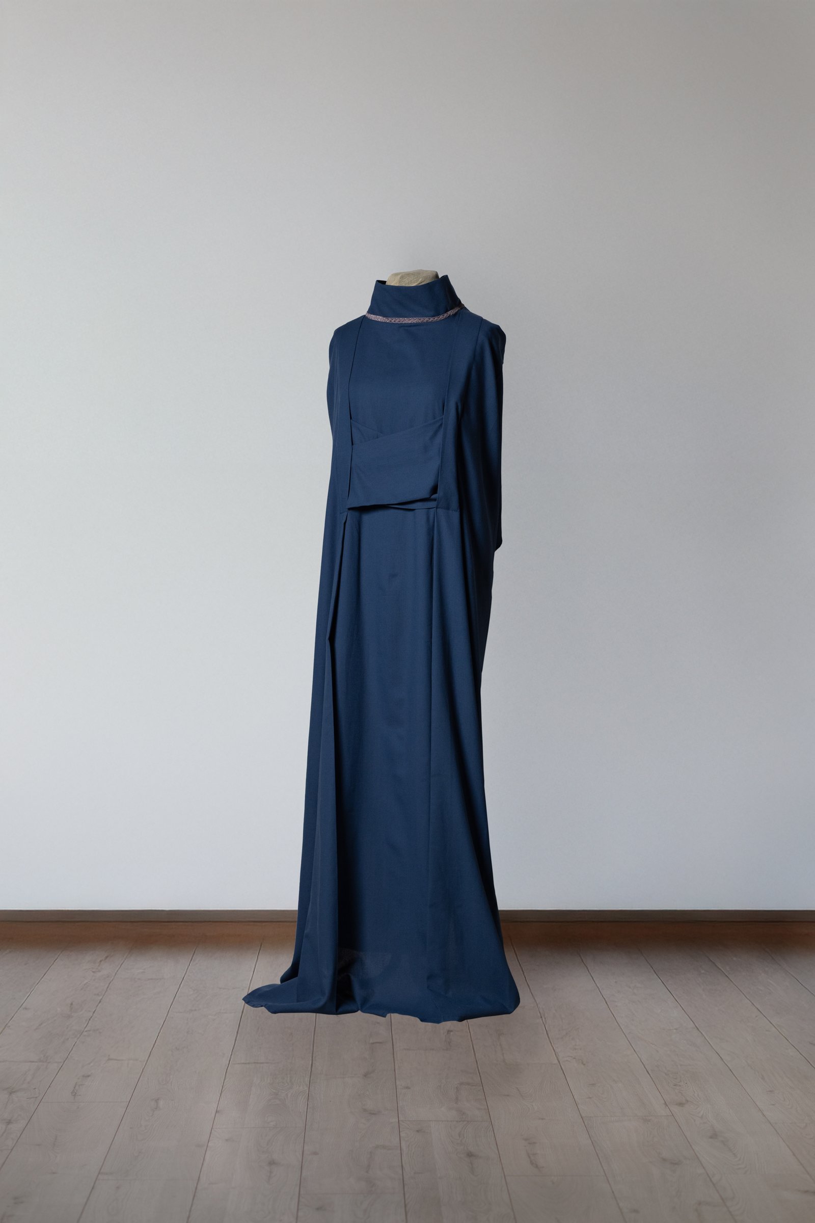 Mėlynos spalvos laidotuvių suknelė, skirta ramiam ir oriam atsisveikinimui.