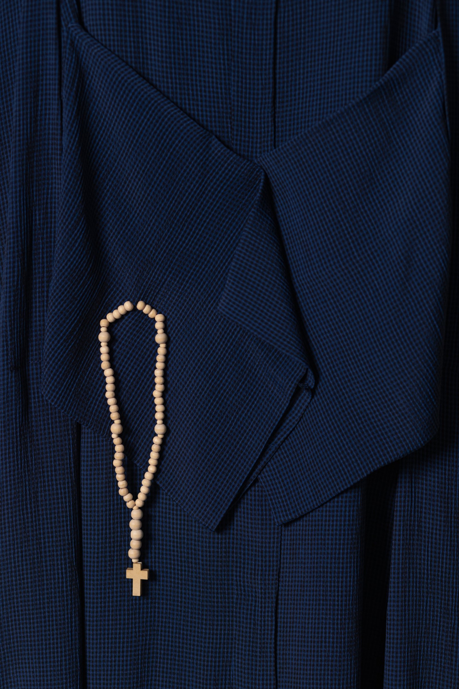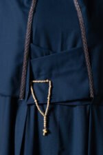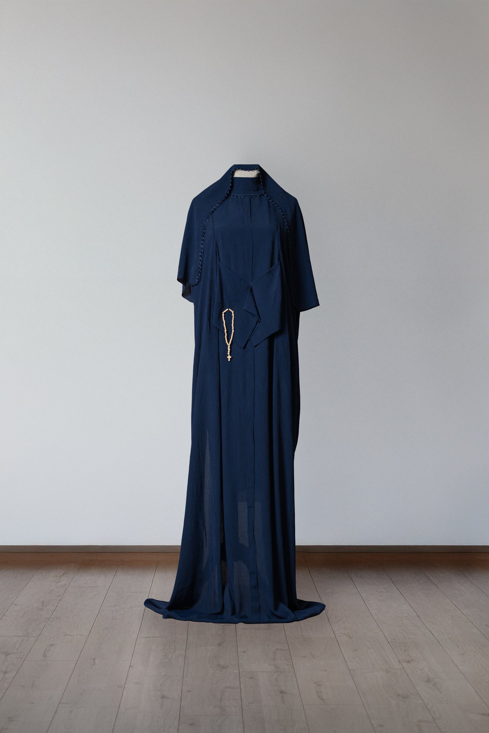 Visi aprangos elementai suderinti tarpusavyje, todėl sukuriamas vientisas ir ramus vizualinis vaizdas, tinkantis atsisveikinimo aplinkai.