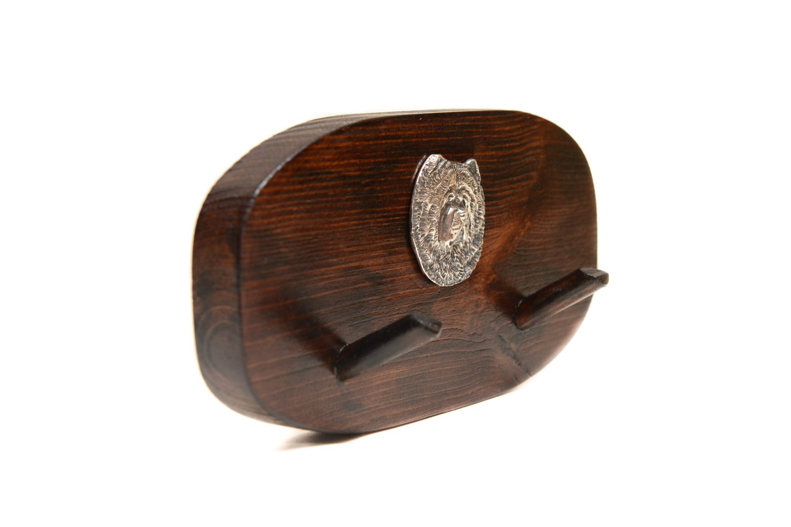 Ši medinė šunų pakaba – tai rankų darbo unikalus aksesuaras, skirtas interjerui suteikti ir funkcionalumo, ir elegancijos. Klasikinį stilių atspindi pušies medienos ir pasidabruoto, sudėtingai pagaminto šuns reljefo derinys. Pakabą galima naudoti kaip tradicinę drabužių kabyklą, taip pat kaip pavadėlio ir kitų šuns aksesuarų pakabą, parodoje iškovotų medalių eksponatą arba kaip raktų kabliuką. Universali jos paskirtis kalba pati už save – tai bus tikrai praktiška dovana bet kuriam šunų mylėtojui!