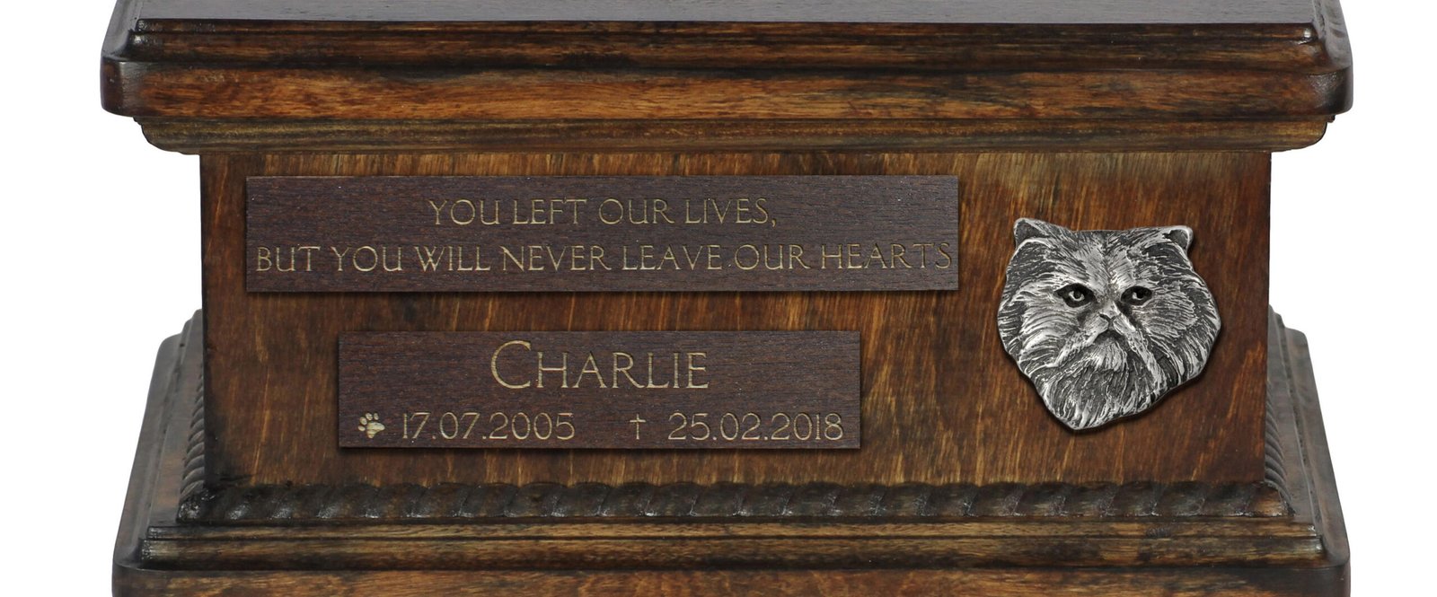Ši išskirtinė urna sukurta taip, kad ją būtų galima personalizuoti. Matomas priekyje medines lenteles išgraviruosime jūsų pateiktais duomenimis, tokiais kaip katės vardas, gimimo ir mirties data, taip pat citata. Estetiškas sidabrinis emblemas su veislės atvaizdu papuoš kompoziciją.