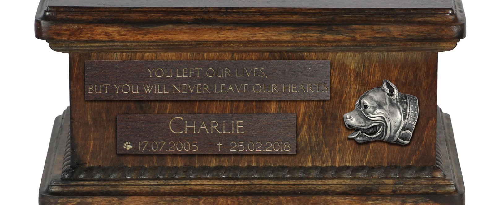 Ši unikali urna yra suprojektuota taip, kad galėtumėte ją pritaikyti asmeniškai. Ant priekinės matomos medinės lentelės įgraviruosime jūsų pateiktus detalus, tokius kaip šuns vardas, gimimo ir mirties data bei citata. Estetiškas sidabrinis emblemas su veislės atvaizdu puošia kompoziciją.