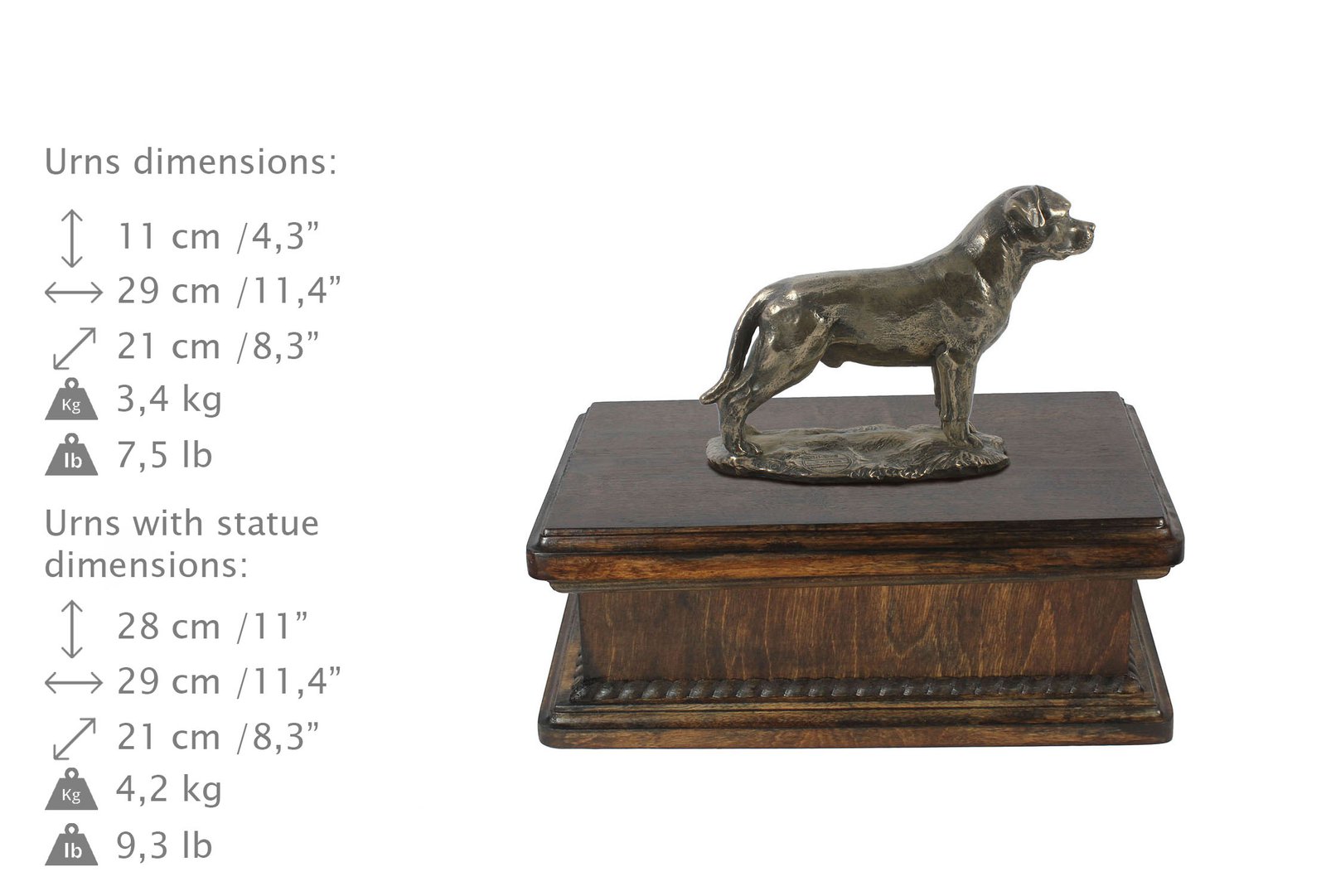 Ši rankų darbo, medinė urna pasižymi aukštu estetika ir klasikiniu dizainu. Talpykla papuošta mediniu vainiku, įrengta patogiais, variniais rankenėliais. Ant dangčio centriniame taške tvirtai pritvirtinta išskirtinė kolekcijos statulėlė. Šuns figūra atspindi rūšies išvaizdos charakteringas savybes. Dangtį lengvai nuimsite, kad galėtumėte įdėti pelenus į vidų.