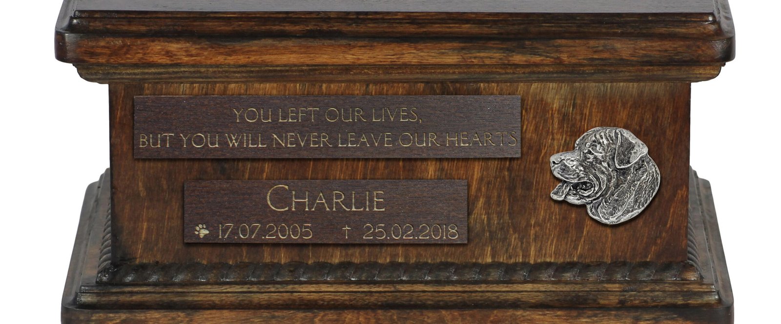 Ši unikali urna yra suprojektuota taip, kad galėtumėte ją pritaikyti asmeniškai. Ant priekinės matomos medinės lentelės įgraviruosime jūsų pateiktus detalus, tokius kaip šuns vardas, gimimo ir mirties data bei citata. Estetiškas sidabrinis emblemas su veislės atvaizdu puošia kompoziciją.