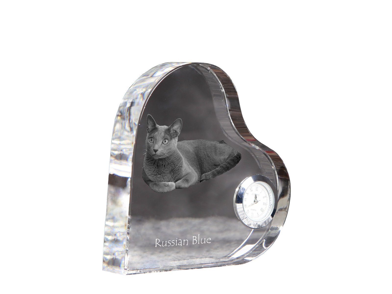 Rusų mėlynasis (Russian Blue) – Krištolo laikrodis su katės nuotrauka