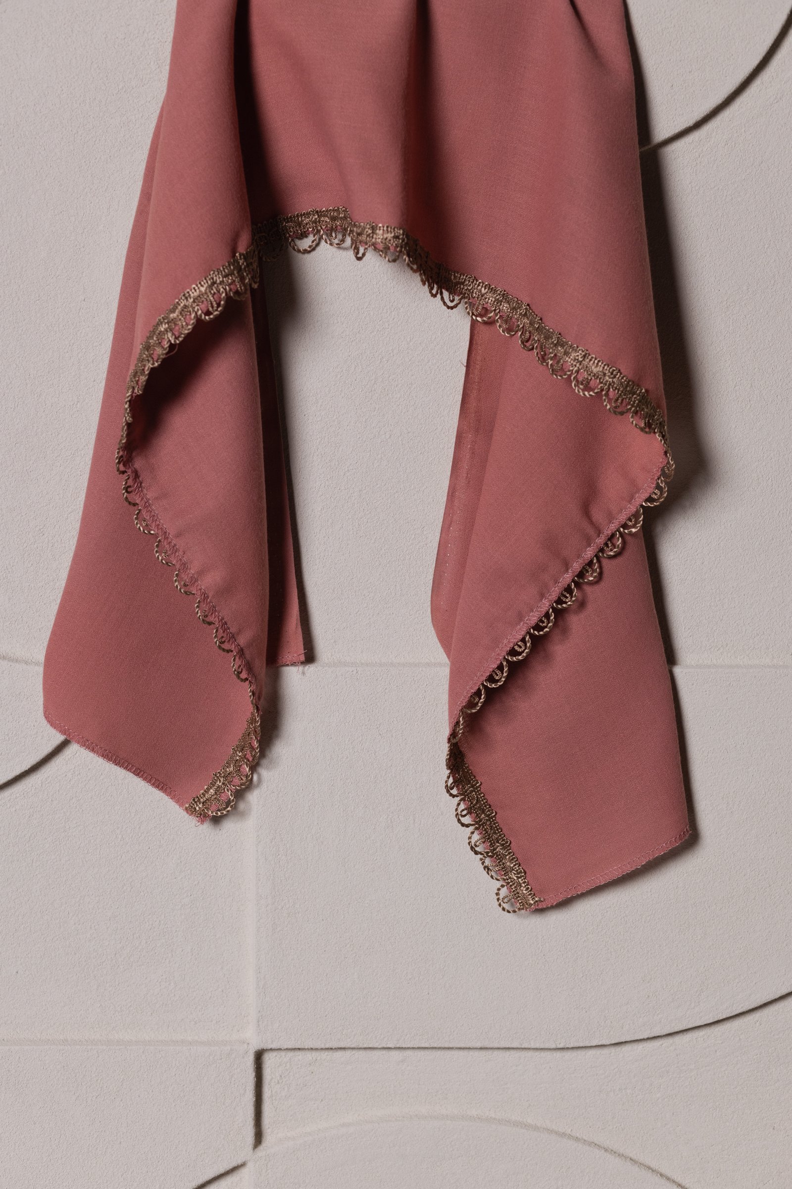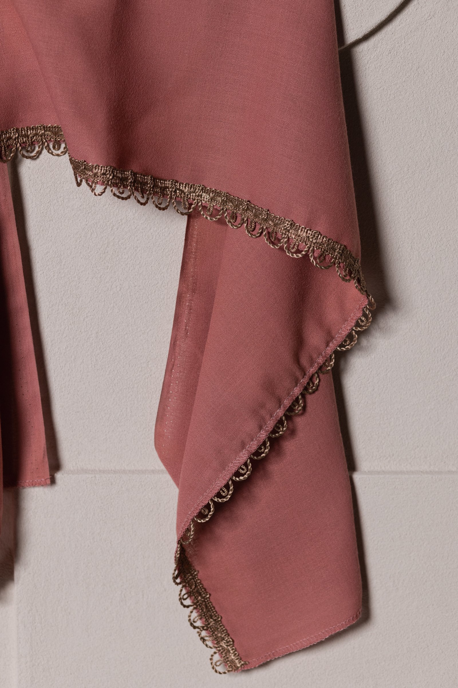 Švelni rusva rožinė skara su auksiniu nėrinių kraštu, suteikianti jaukų ir pagarbų atsisveikinimo akcentą.