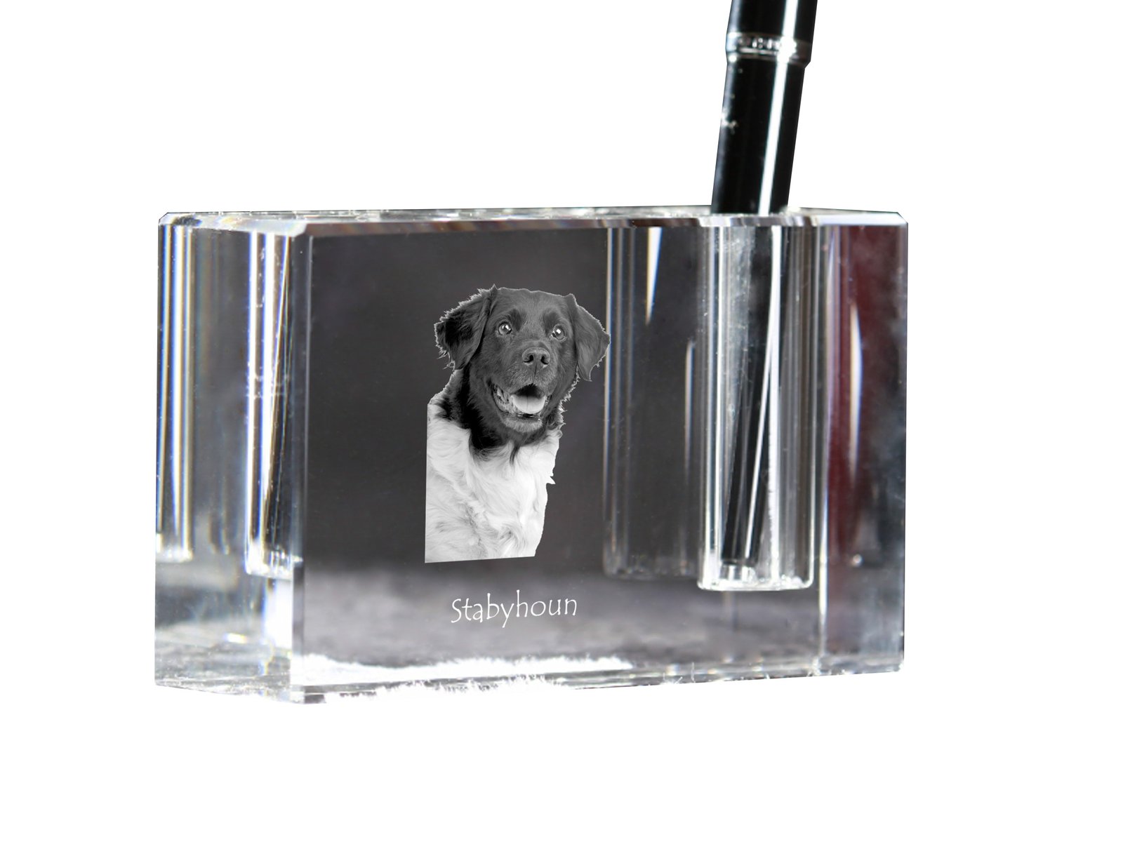 Šis elegantiškas rašiklių stovas yra unikalus rašomojo stalo aksesuaras, pagamintas iš aukštos kokybės krištolo. Papuoštas žavingu augintinio paveikslėliu, jis traukia akį ir suteikia asmeniškumo bet kuriai darbo vietai. Stovas turi vieną rašiklio lizdą, todėl idealiai tinka vertinantiems tvarką ir minimalizmą. Be to, yra galimybė jį personalizuoti su savo augintinio nuotrauka, todėl tai puiki dovana įvairiomis progomis. Dėl kompaktiško dydžio ir stilingo dizaino jis puikiai dera prie bet kokio interjero.