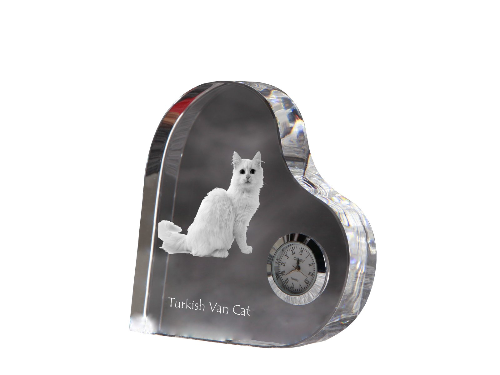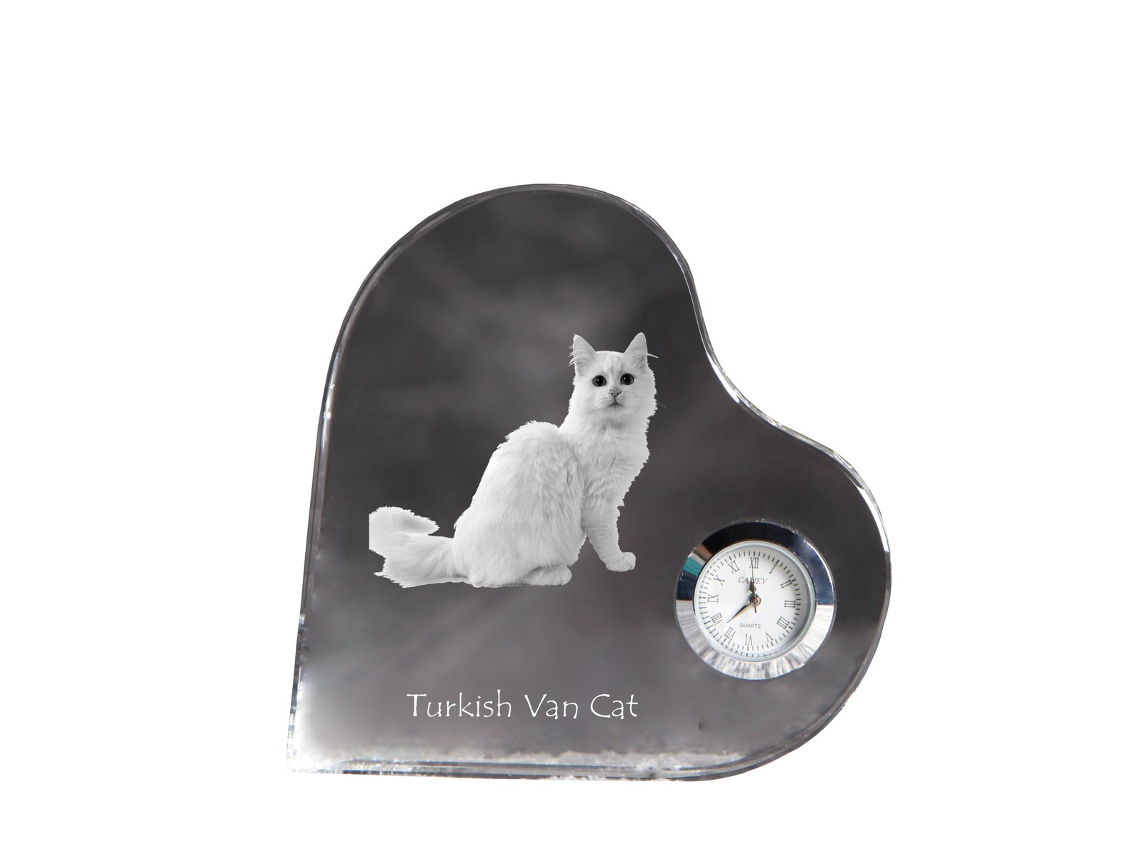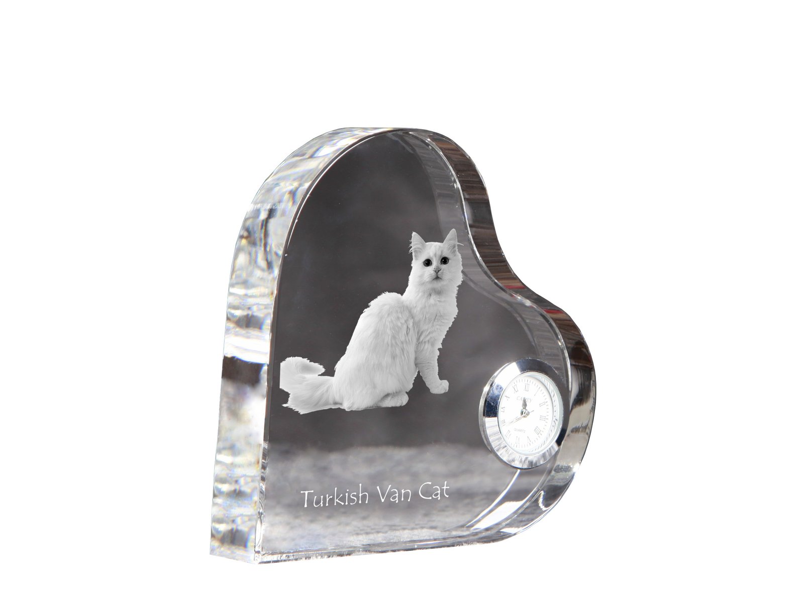 Turkų van katė (Turkish Van) – Krištolo laikrodis su katės nuotrauka