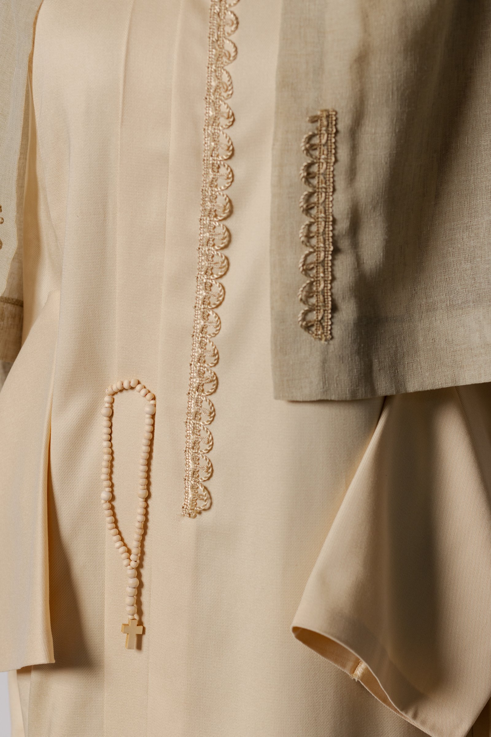 Visi aprangos elementai suderinti tarpusavyje, todėl sukuriamas vientisas ir ramus vizualinis vaizdas, tinkantis atsisveikinimo aplinkai.