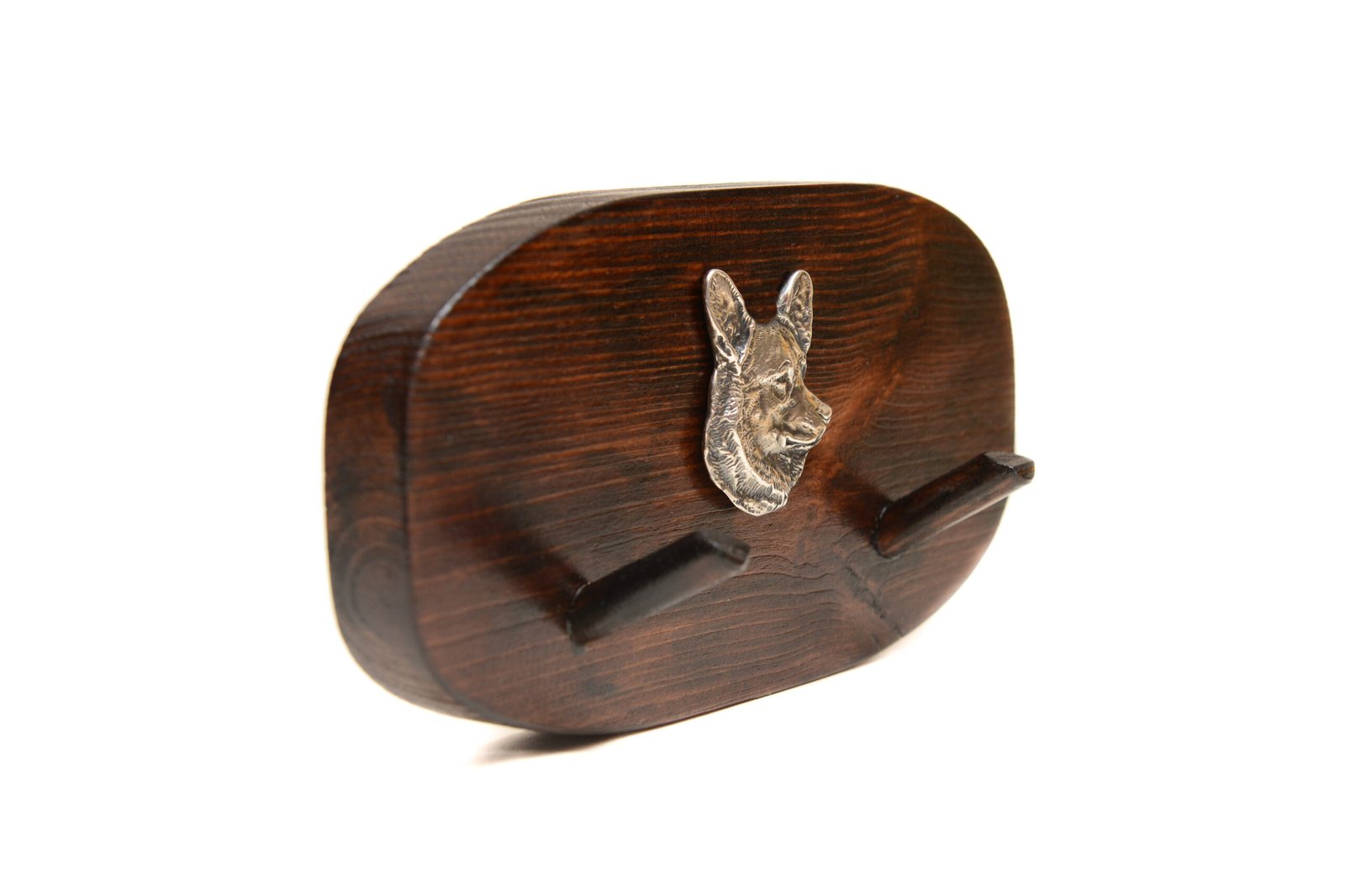 Ši medinė šunų pakaba – tai rankų darbo unikalus aksesuaras, skirtas interjerui suteikti ir funkcionalumo, ir elegancijos. Klasikinį stilių atspindi pušies medienos ir pasidabruoto, sudėtingai pagaminto šuns reljefo derinys. Pakabą galima naudoti kaip tradicinę drabužių kabyklą, taip pat kaip pavadėlio ir kitų šuns aksesuarų pakabą, parodoje iškovotų medalių eksponatą arba kaip raktų kabliuką. Universali jos paskirtis kalba pati už save – tai bus tikrai praktiška dovana bet kuriam šunų mylėtojui!