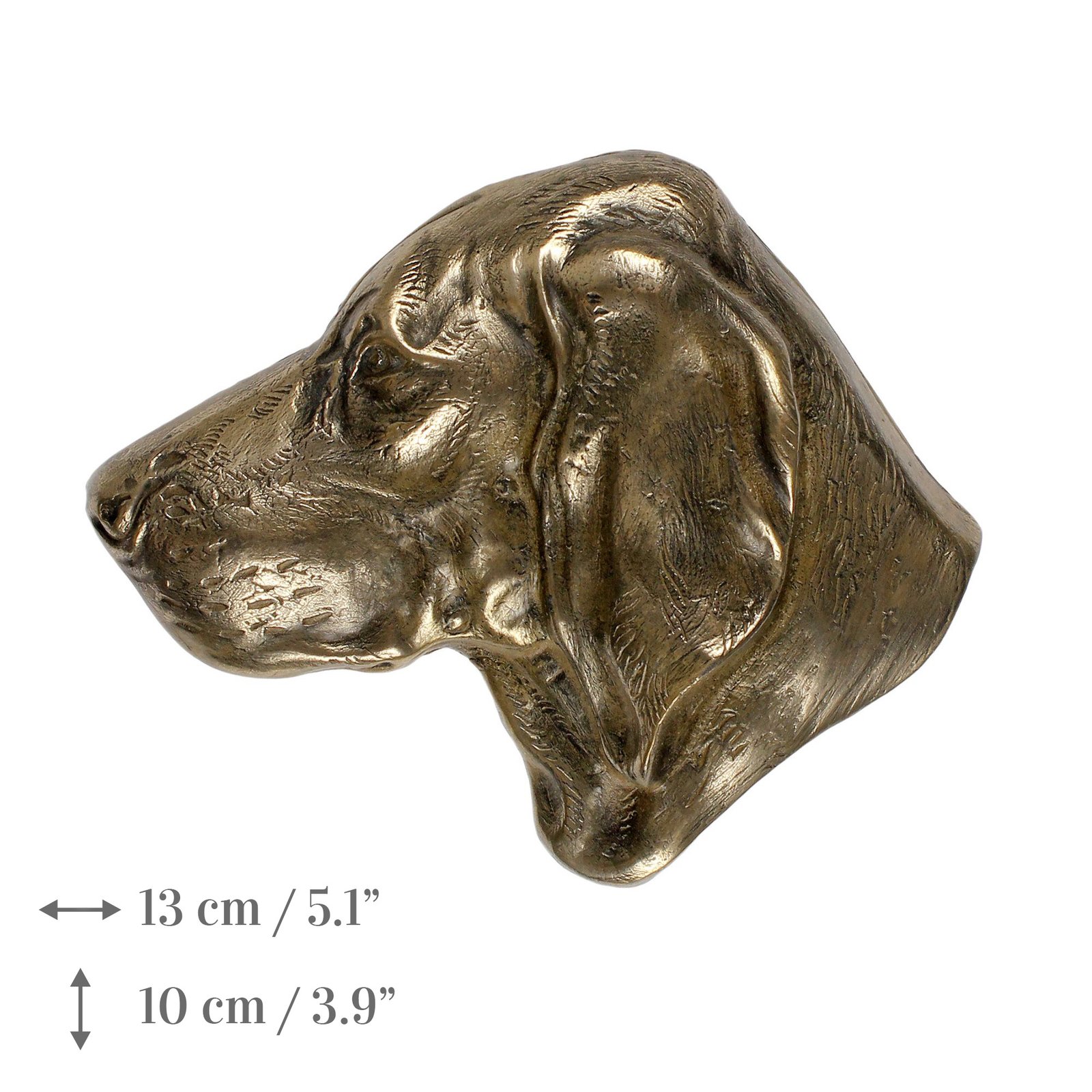 Pristatome išskirtinį šaltu lietu išlietą bronzos šuns galvos reljefą. Dėl jo atsparumo oro sąlygoms, šis reljefas puikiai tinka lauke, pavyzdžiui, kaip papuošalas ant šuns kapo, bet taip pat puikiai tiks ir namuose.