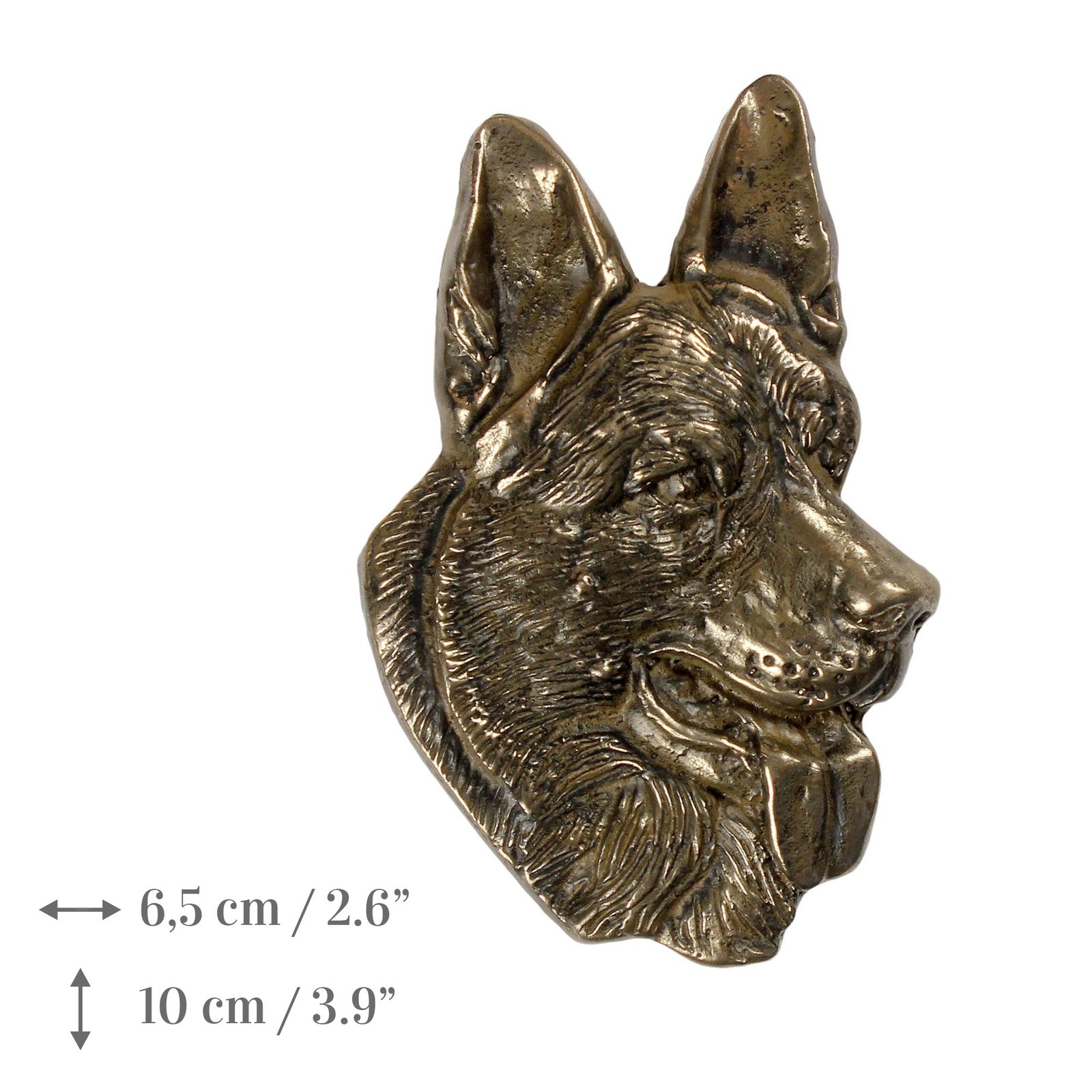 Pristatome išskirtinį šaltu lietu išlietą bronzos šuns galvos reljefą. Dėl jo atsparumo oro sąlygoms, šis reljefas puikiai tinka lauke, pavyzdžiui, kaip papuošalas ant šuns kapo, bet taip pat puikiai tiks ir namuose.