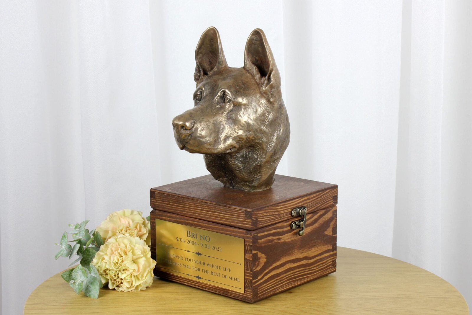 Pagrindinis urnos elementas yra gražiai pagaminta šalto lietaus bronzos šuo. Toks medžiagų derinys užtikrina ilgaamžiškumą ir amžiną grožį. Prašome būti labai atsargiems atidarant urną – statulėlė, pritvirtinta prie jos dangčio, yra sunkesnė nei dėžutė. Ją reikia tvirtai laikyti atidarant konteinerį, kad jos nepaleistumėte ir nepažeistumėte.