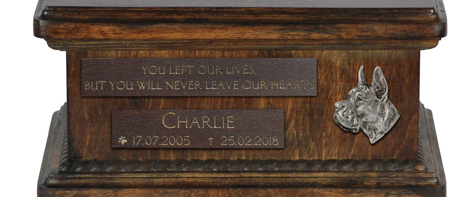 Ši unikali urna yra suprojektuota taip, kad galėtumėte ją pritaikyti asmeniškai. Ant priekinės matomos medinės lentelės įgraviruosime jūsų pateiktus detalus, tokius kaip šuns vardas, gimimo ir mirties data bei citata. Estetiškas sidabrinis emblemas su veislės atvaizdu puošia kompoziciją.