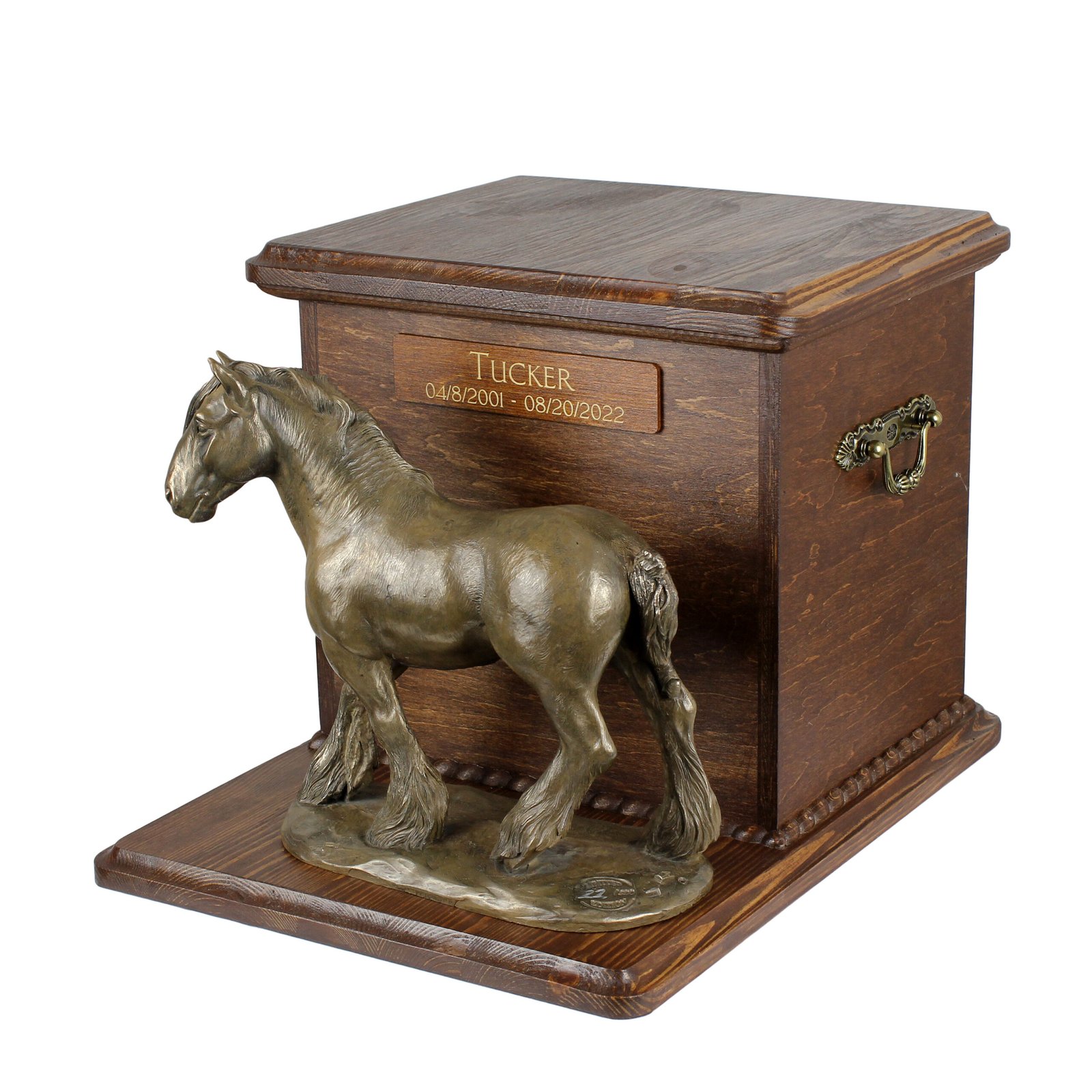 Ši rankų darbo, medinė urna pasižymi aukštu estetika ir klasikiniu dizainu. Indas papuoštas mediniu vainiku, jame yra patogios varinės rankenos. Dangtį lengvai nuimti, kad būtų galima įdėti pelenus į vidų. Ant išilgai pagrindo tvirtai pritvirtinta unikali statulėlė iš kolekcijos. Arklio figūra atspindi rūšies išvaizdos charakteringas savybes.