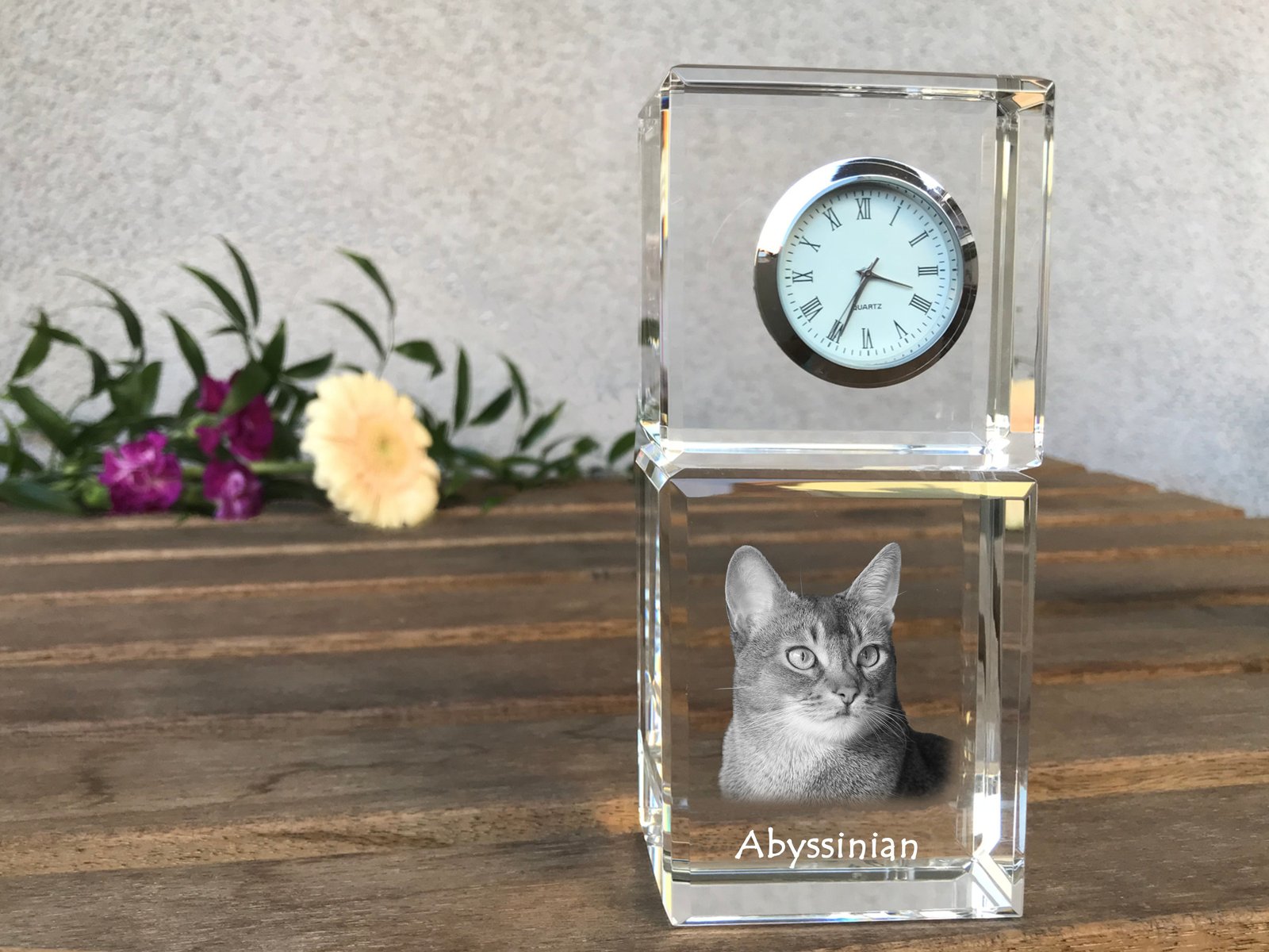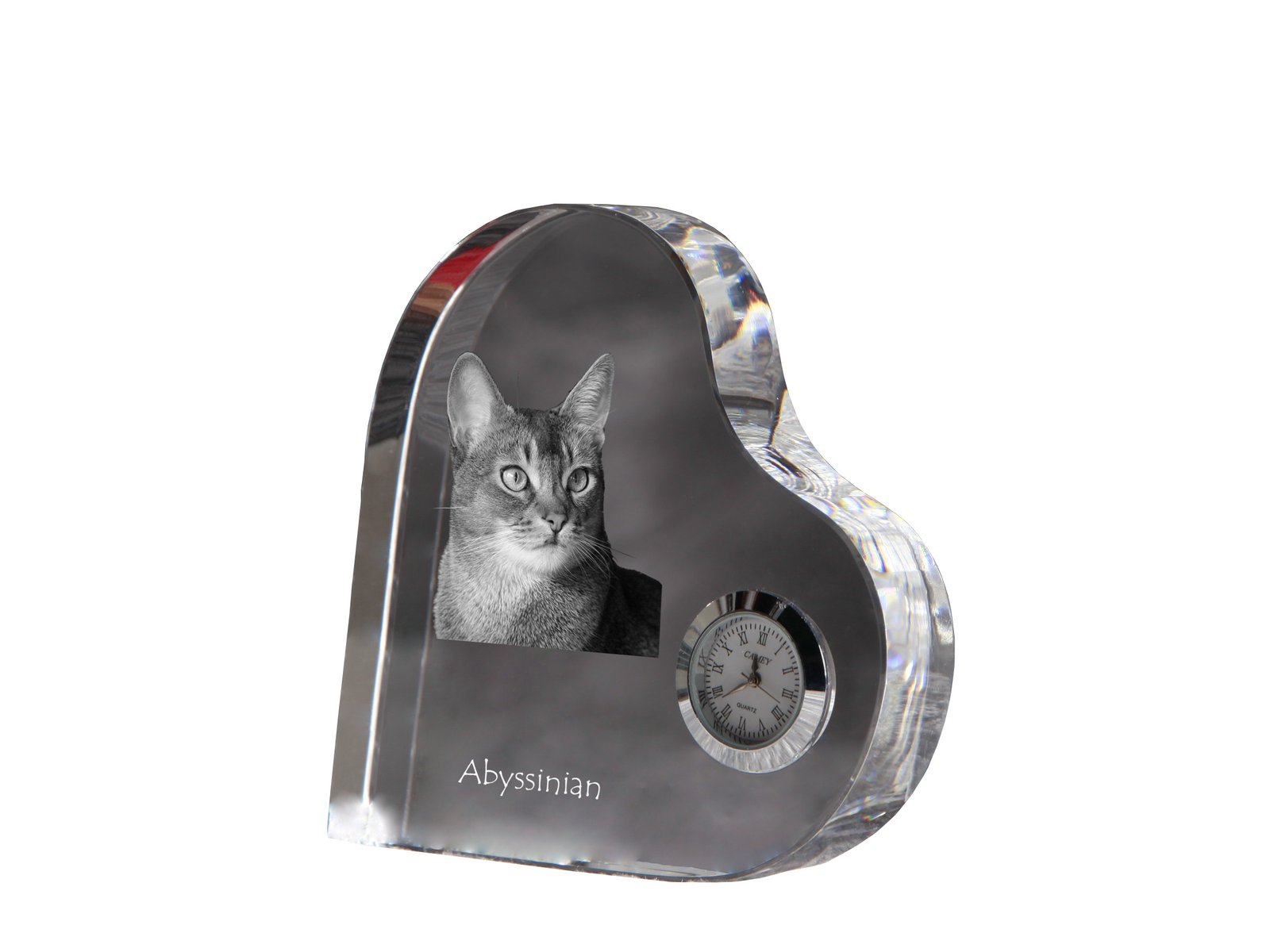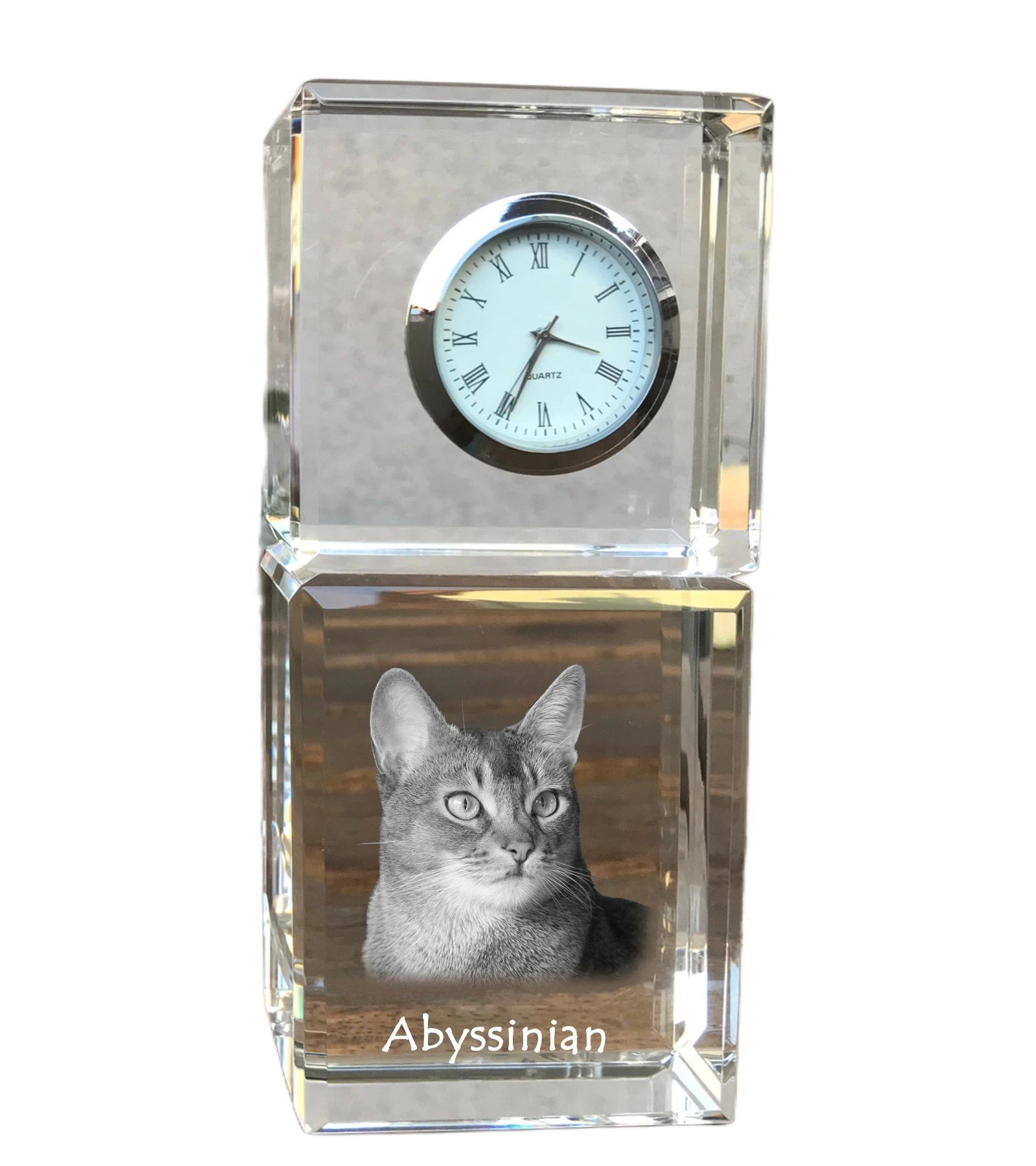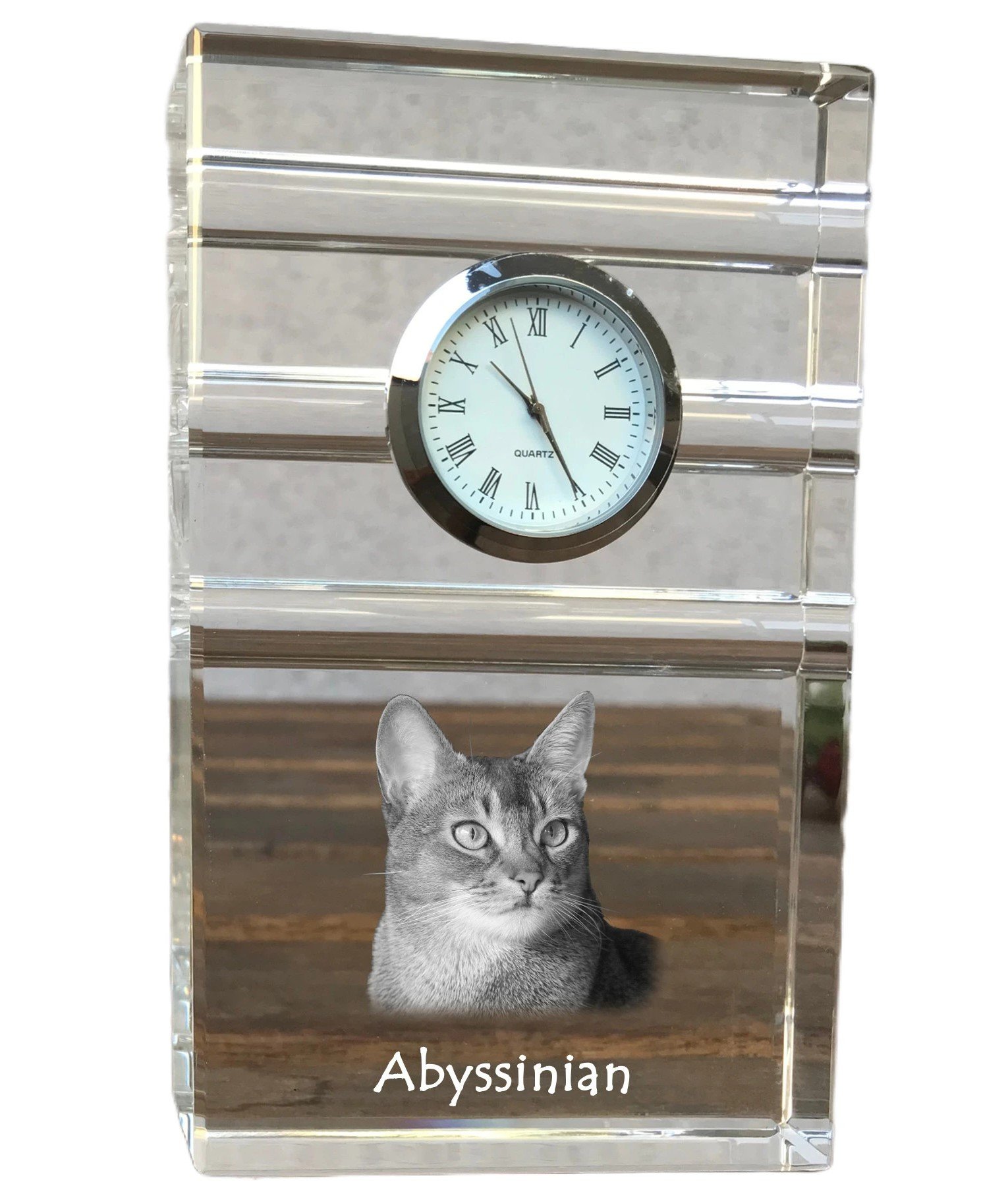 Abisinijos katės (Abyssinian) – Krištolo laikrodis su katės nuotrauka