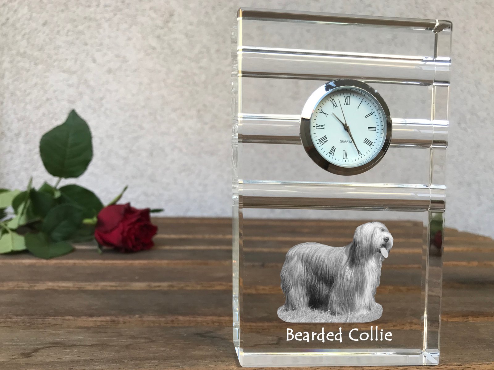 Barzdotasis kolis (Bearded Collie) – Stiklinis laikrodis su nuotrauka