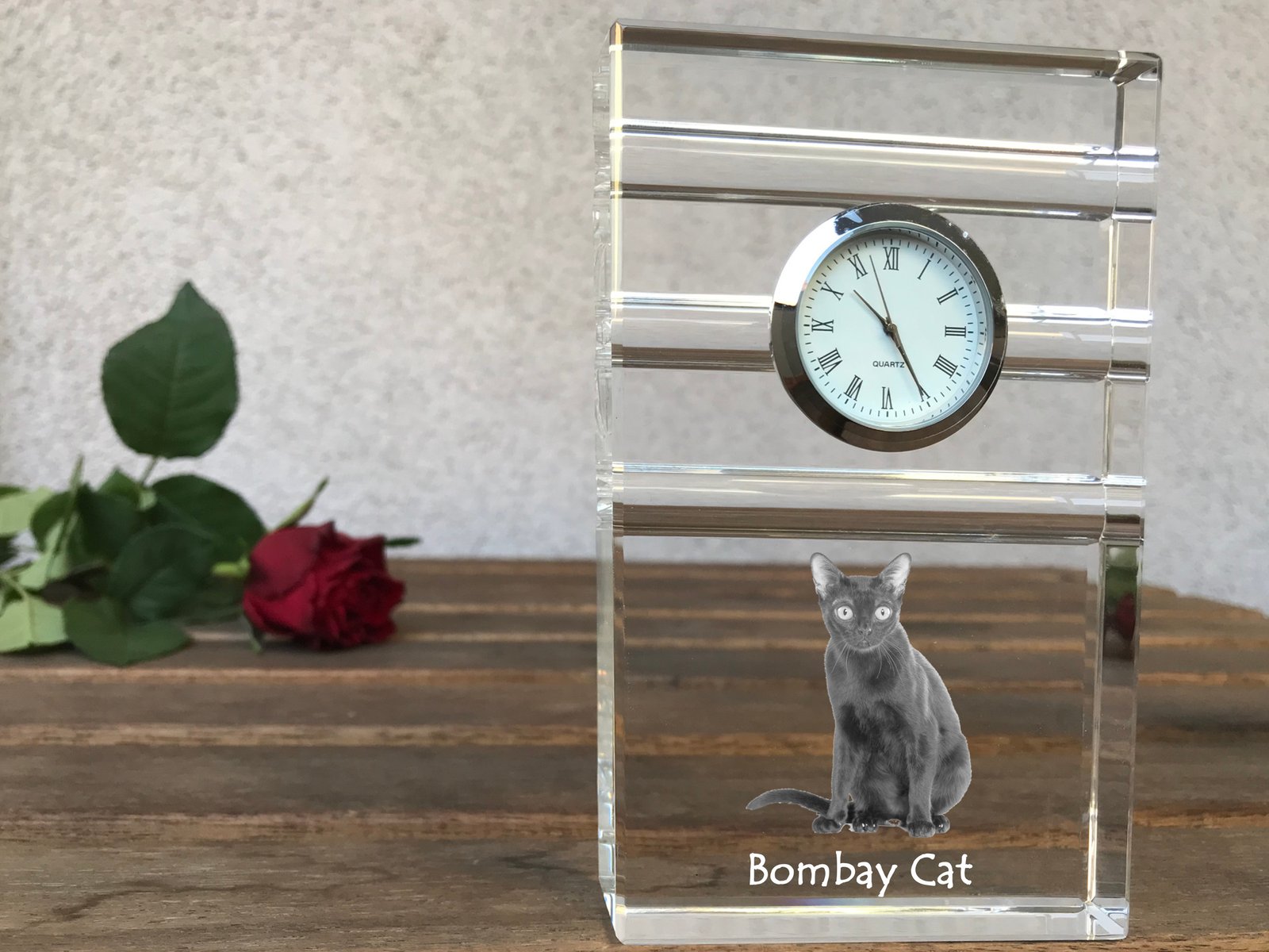 Bombėjaus katė (Bombay cat) – Krištolo laikrodis su katės nuotrauka